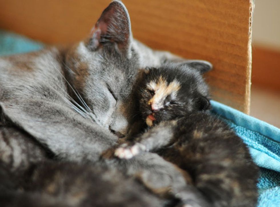 The shy tortie girl has come a long way since birth. "She's starting to play and purr when I hold her," said Lindsey, happy to report Gia's progress.