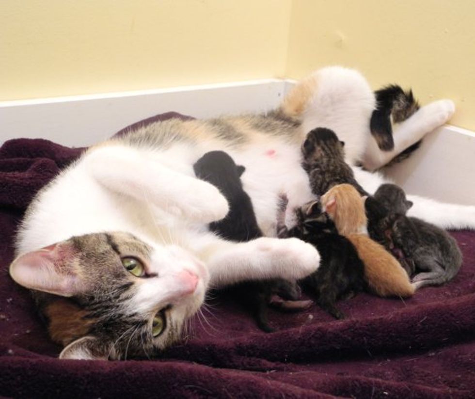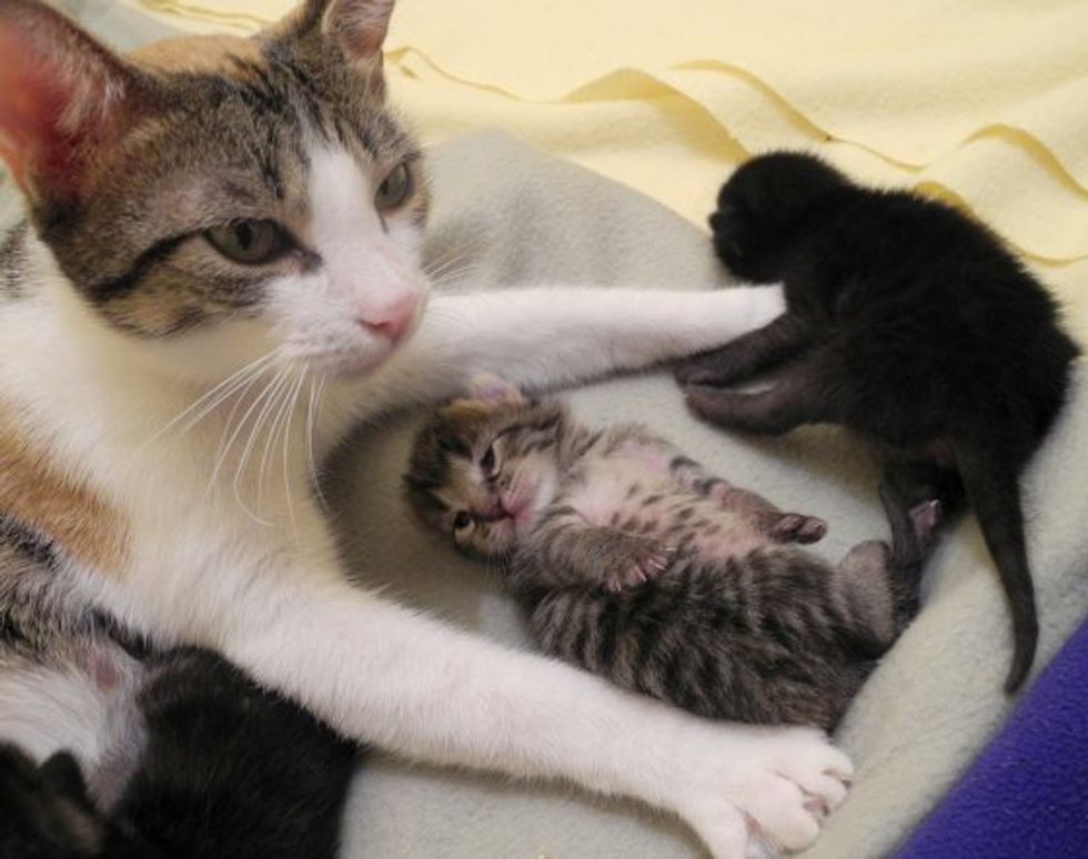 Perti with her 10-hour-old kittens. She is such a good mommy!