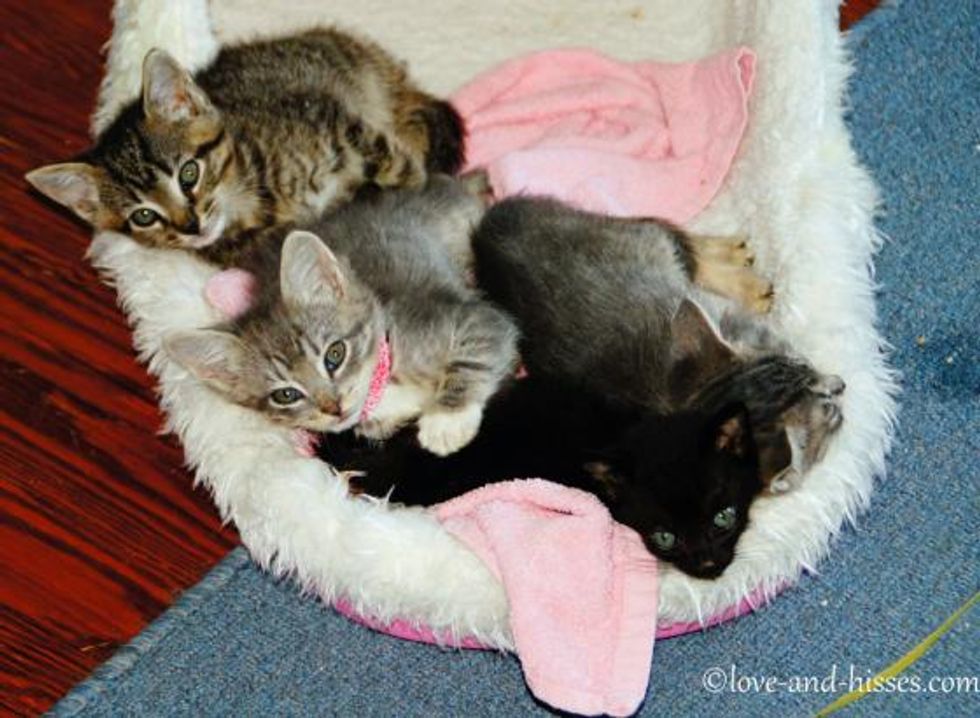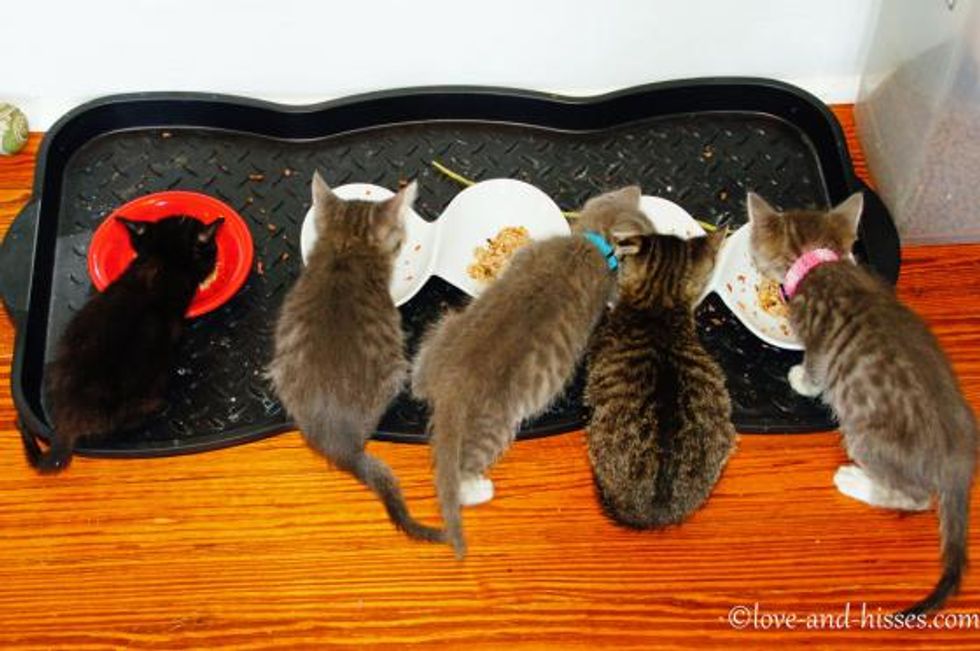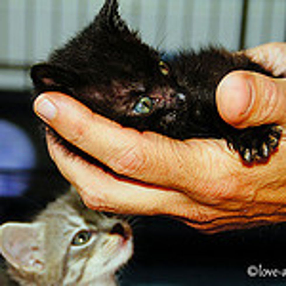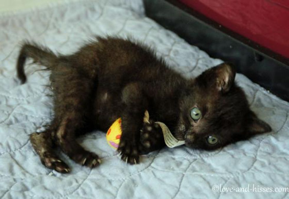 After rescuing four small stray kittens without their mother, a fifth, much smaller kitten was found. "On Auguest 8th, 2012, he came to join his siblings. He had a very rough start, but persevered, and is currently doing well," said Robyn Anderson.