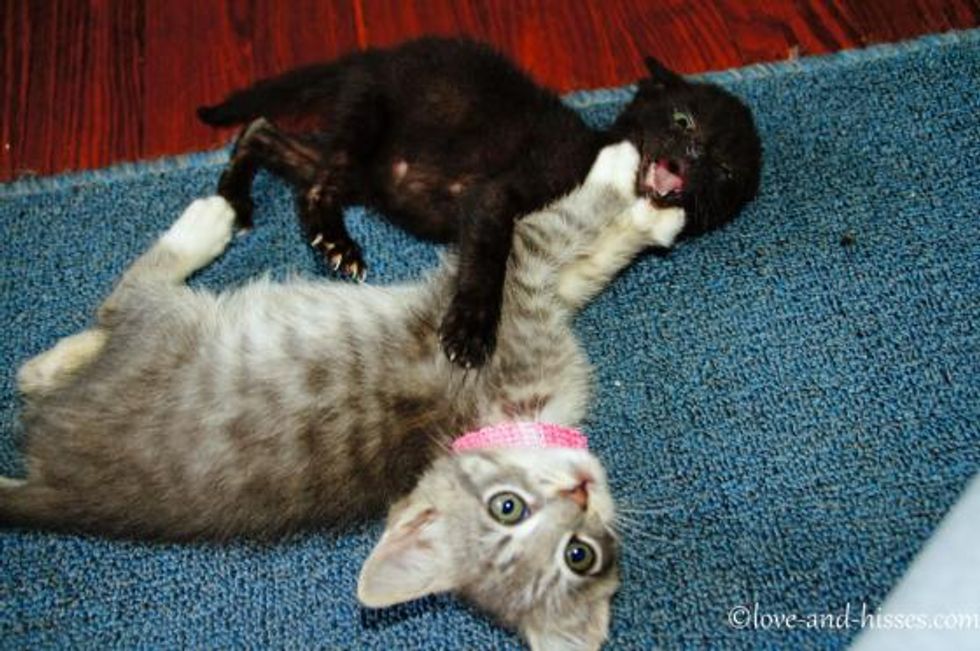 "When we found him Friday morning, I would have said there was no chance that he was going to make it.... Not only has he started eating like it’s going out of style, but yesterday he started PLAYING, and I only wish I had taken the camera upstairs with me when I went up to offer them some wet food at noon. After he ate (and ate and ate and ate), Tony (Rocky Horror) Pickle walked around and batted at toys, and then he play-fought with Polly and with Joe, and in both cases the bigger kittens were fairly gentle with him, but when he thought they were getting the better of him, he growled and yowled, and Polly and Joe backed right off. Oh, he is going to be a force to be reckoned with."