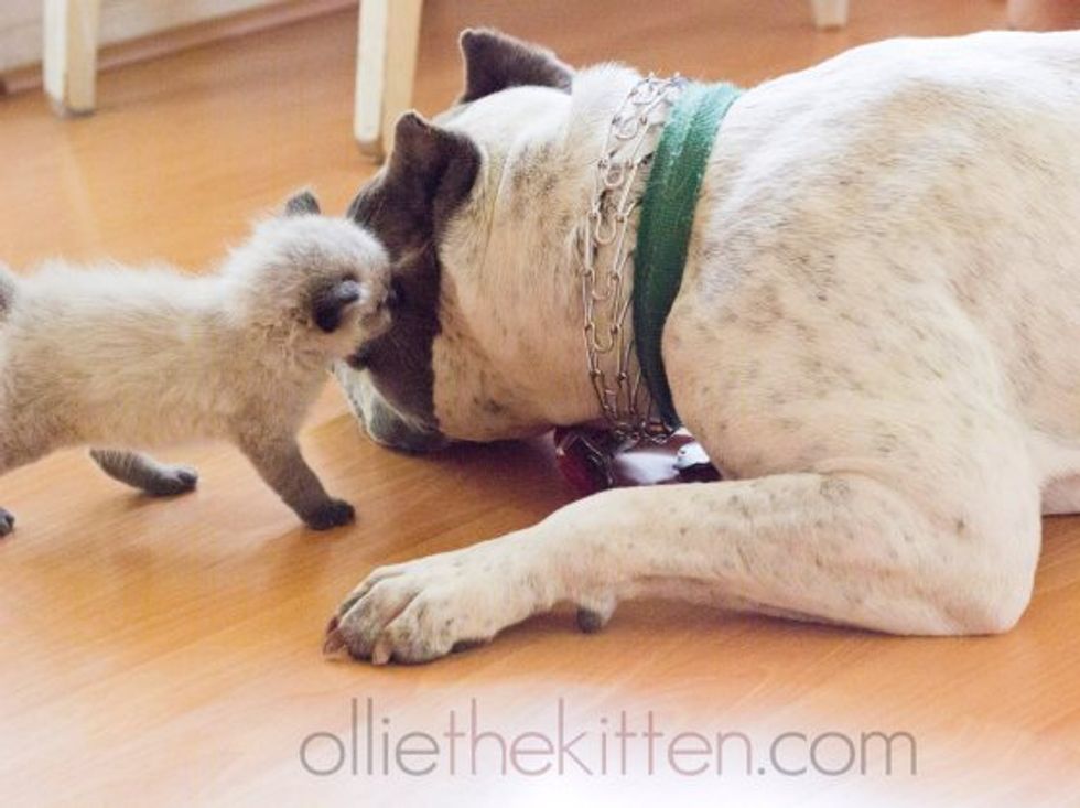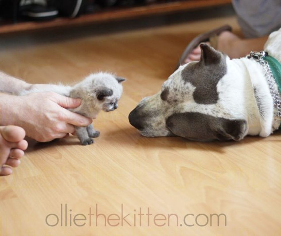 While nursing the little one, Ollie met his new friend, a gentle giant named Bacon the dog. "After Bacon got over his excitement of seeing a kitten (first through a glass door, then through his crate), we let Bacon come into the same room. Bacon was incredibly patient, and also very intuitive about Ollie’s tiny baby size. Bacon lay down to get eye level with Ollie, and let Ollie crawl all over his face," wrote Ryan on Ollie's blog.