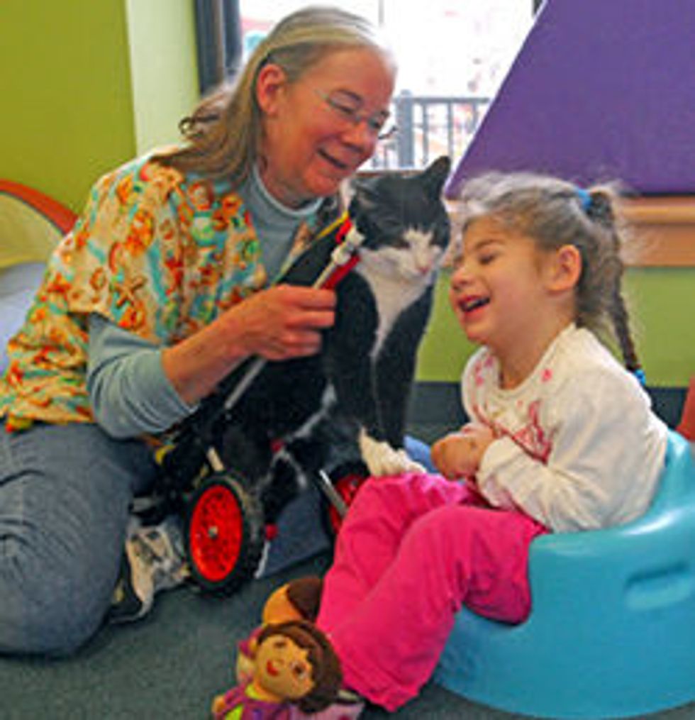 Scooter the cat who moves around on his custom-made wheelcart is a therapy cat who gives those who feel sick love and new hope. This special kitty has inspired so many with his stories that he has recently been named the Cat of the Year by the ASPCA.