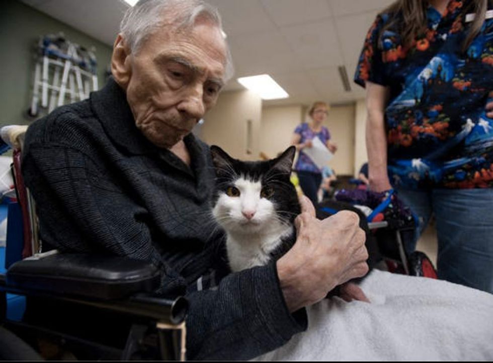 Scooter the therapy cat snuggles up to Ernie Stock, 87