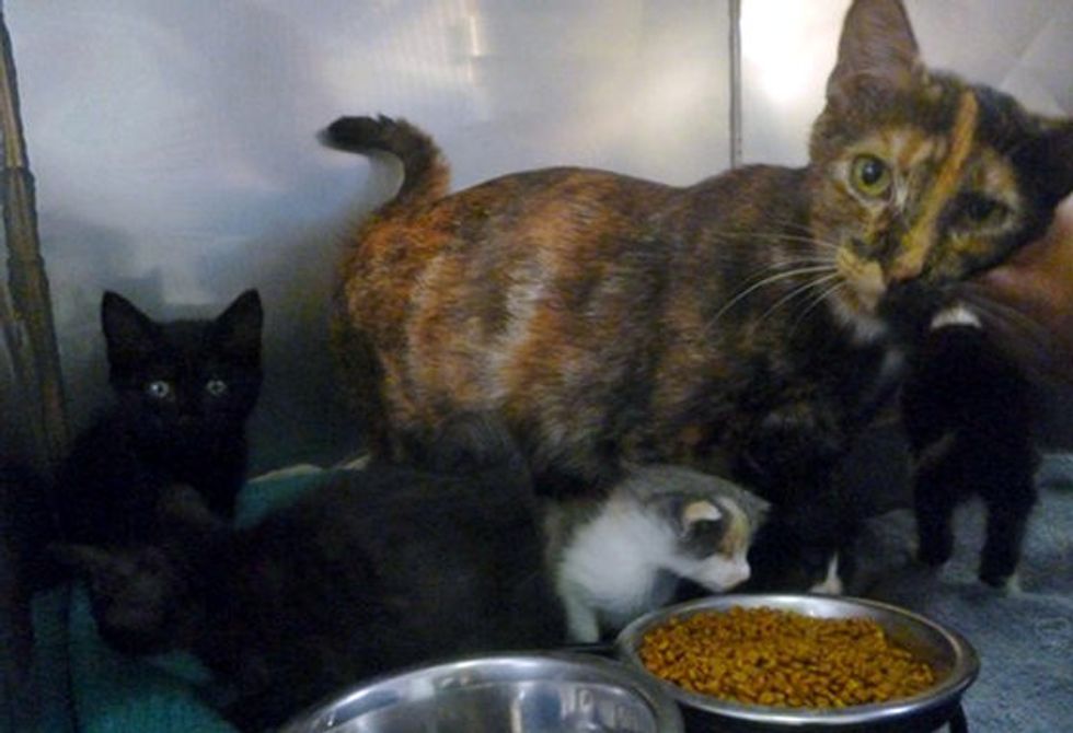 Patra the rescue cat mama nursing her own kittens and 3 adopted kitties