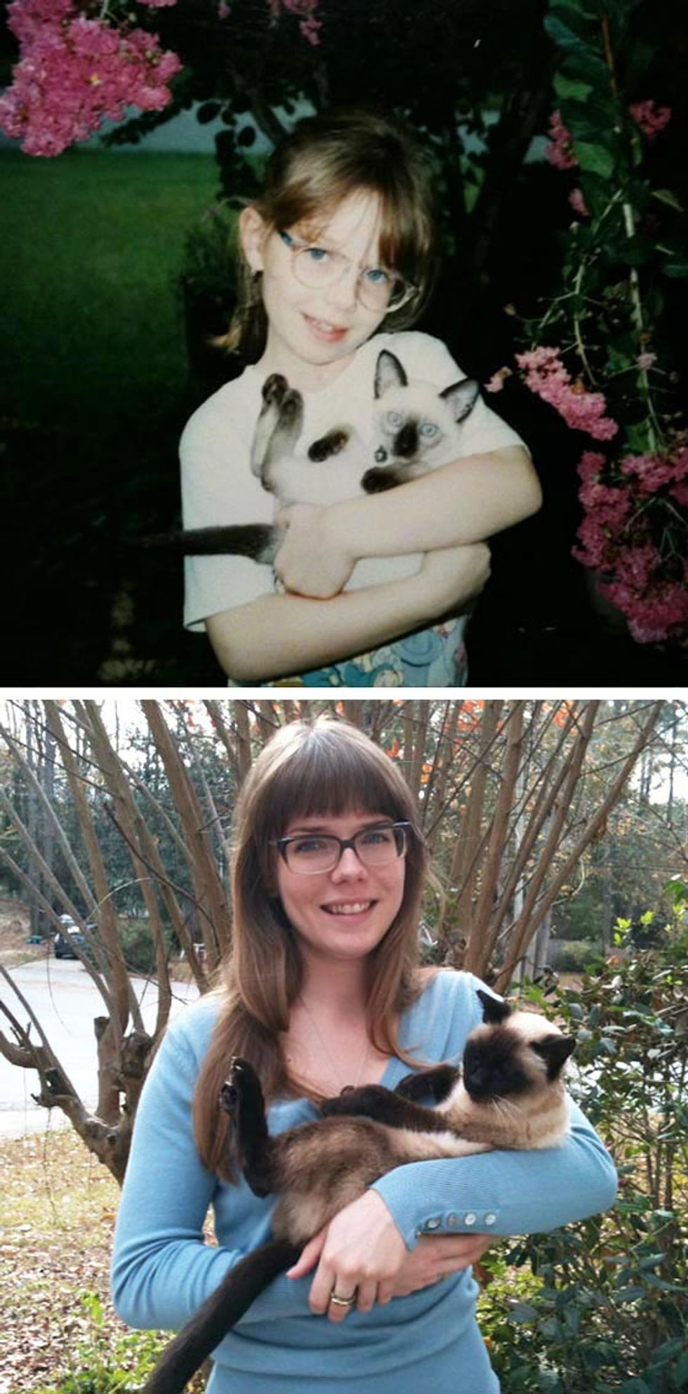 "Same cat, same place, 17 years later. Me and my cat Sylvie," said reddit user bananawhisper.