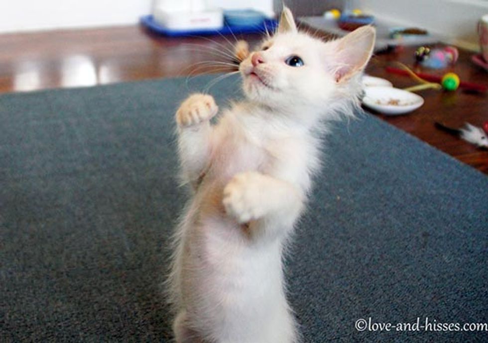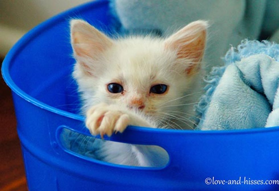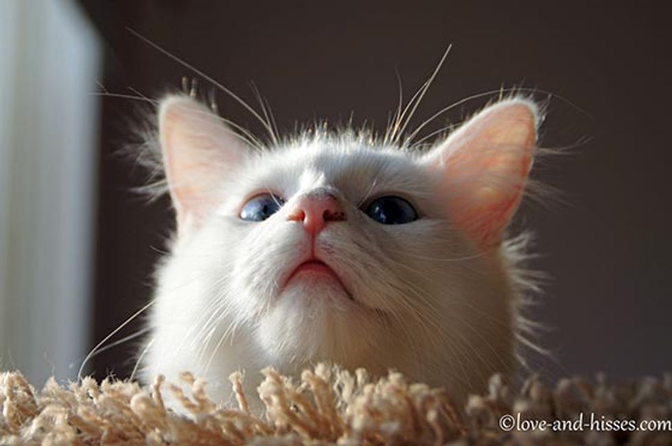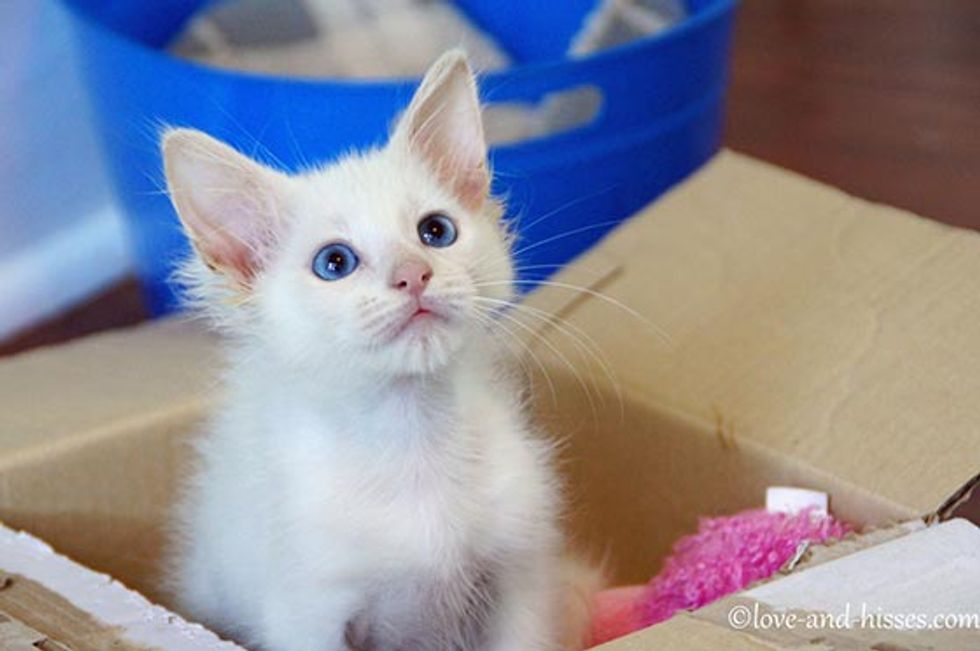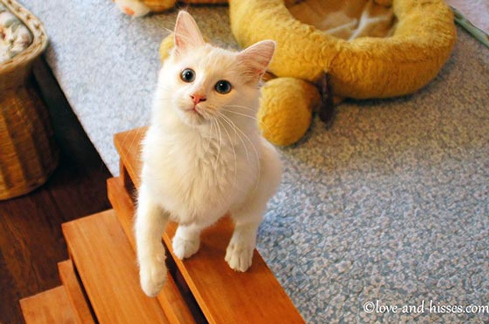 Dandelion, a beautiful white kitty, came from a litter of three girls. They were found abandoned along with their mother near a club in Huntsville, Alabama [via Love and Hisses]. The kittens were sick with watery eyes and a lot of health problems. Little Dandelion was in rough shape when she came to Robyn A., their foster mom [See their story].