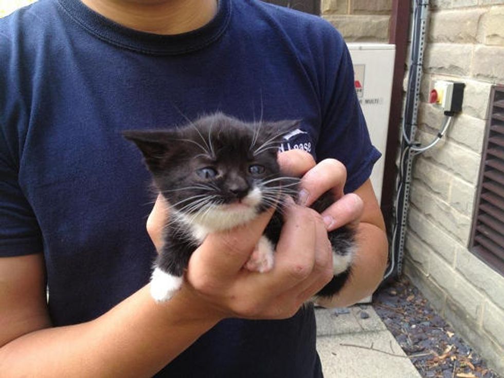 A kind person from England found a tiny tuxedo kitten trapped in a small gap and freed him from it.