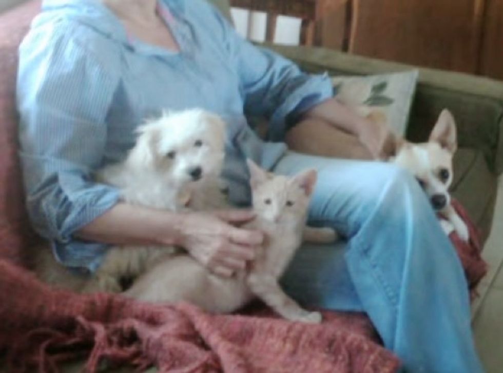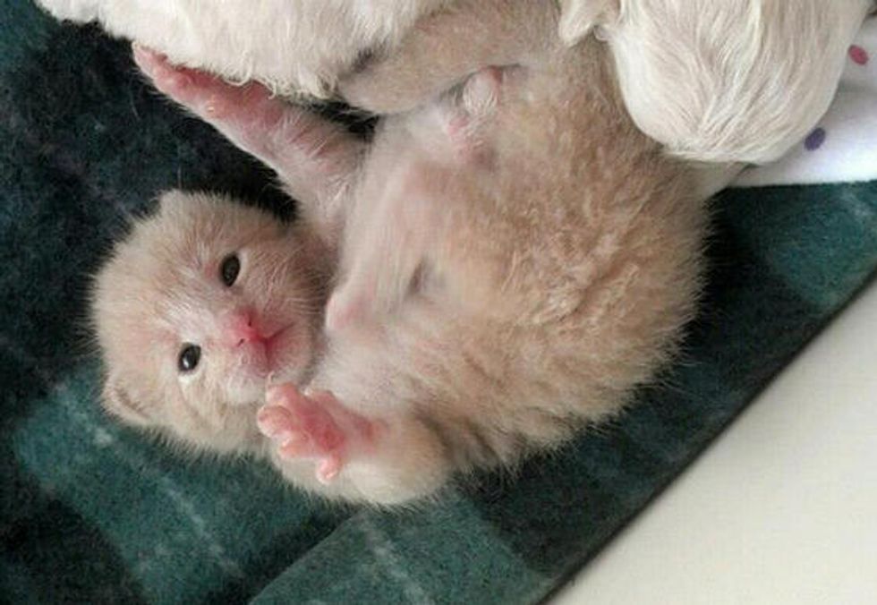 Cocoa Puff the tiny cream kitten was found in a parking garage, with no mother or litter mate in sight. He was only 3 days old, starving in a parking lot. Lacey the poodle puppy was brought into the South LA Shelter after her mother died during childbirth. Kitten Rescue saved both of these little angels and foster mom Laura Hawthorne is bottle raising these orphans as litter mates.