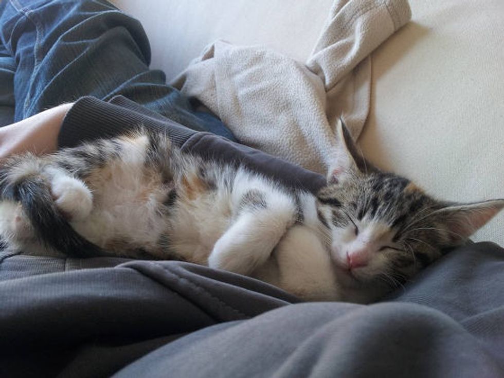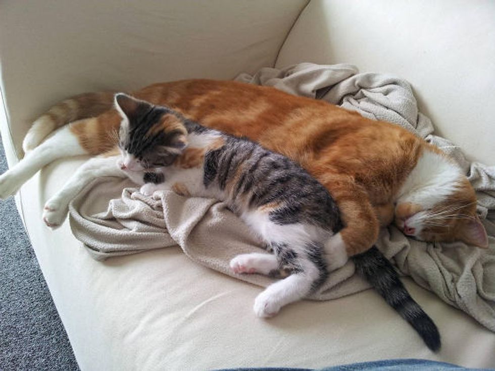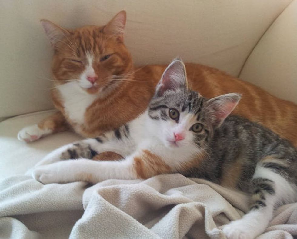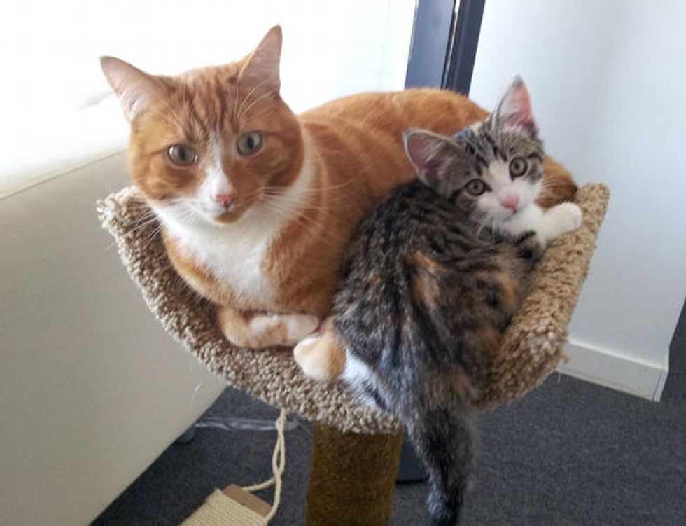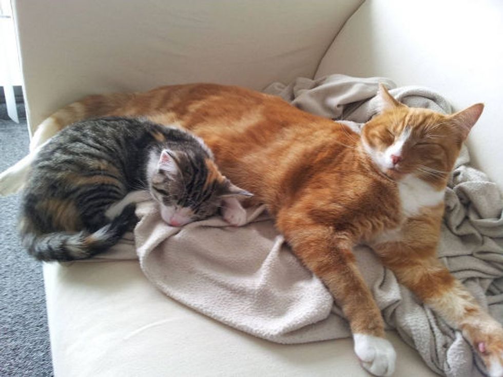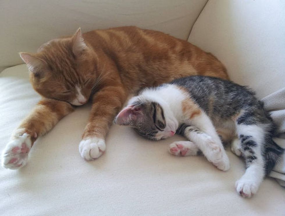 "The orange tabby is named Elroy and he's three year old. The calico kitten is named Olive and she's three months old. When introduced Elroy kept hissing at her for the first couple of days, but Olive is fearless and kept trying to cuddle with him until he finally gave in. Now he's always trying to groom her (and she returns the favour by attacking him)," their human said via reddit.