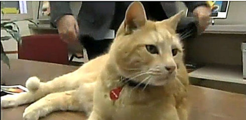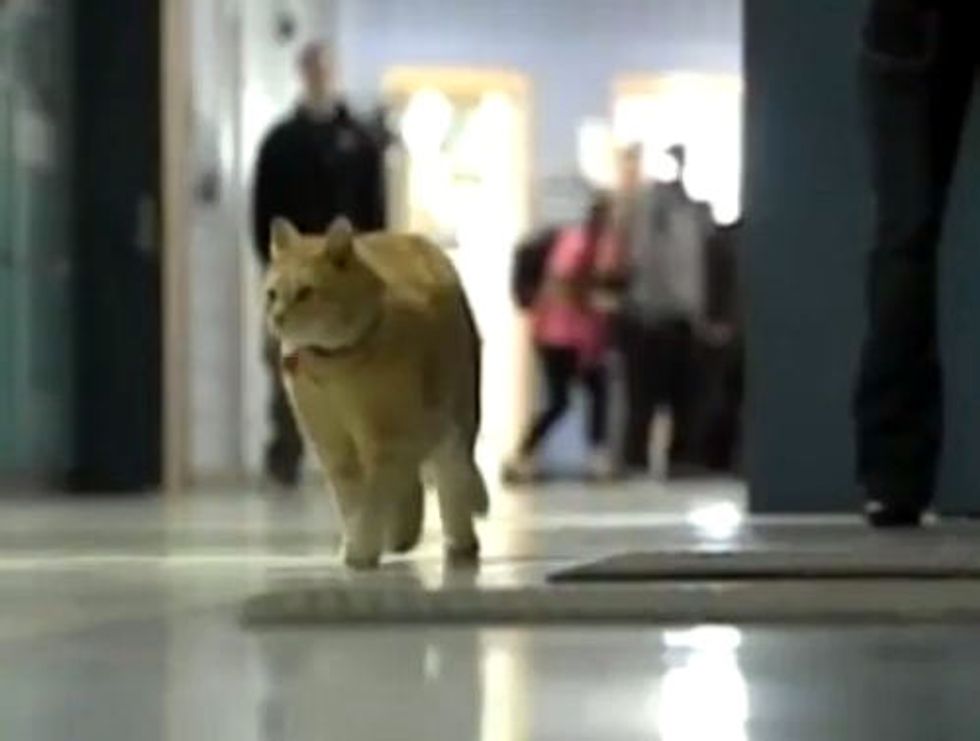 Simba the 15 year old ginger cat has been going to Westbrook High School in Westbrook Maine every morning at 7AM for more than 12 years. He greets students at the front door, visits the superintendent's office for love and cuddles and roams the halls and classrooms to check things out. Simba is no stranger to the students there. In fact, everyone loves him so much that they have decided to honor him for his loyalty to the school with an art show inspired by his cuddly nature.