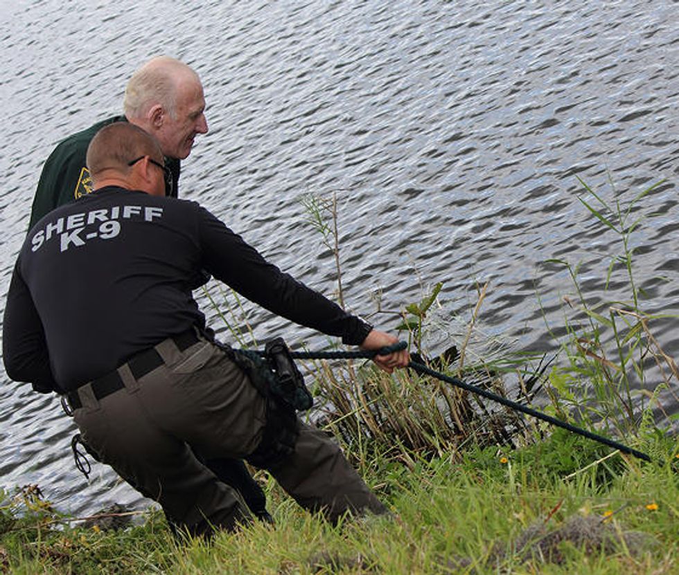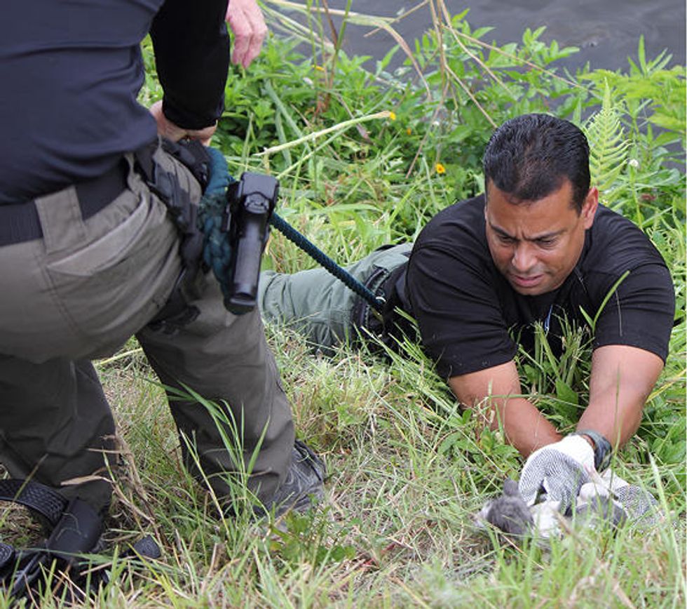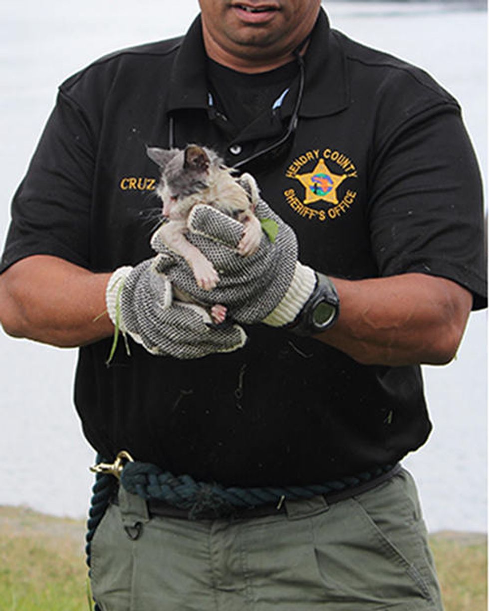 In order to save the little guy, Deputies D.J. Lansaw and David White held onto Deputy Daniel Cruz on a rope as he slowly leaned over the bank of the Caloosahatchee. The kitten was soaked, so they had the little guy wrapped up in a warm towel and taken to get help.