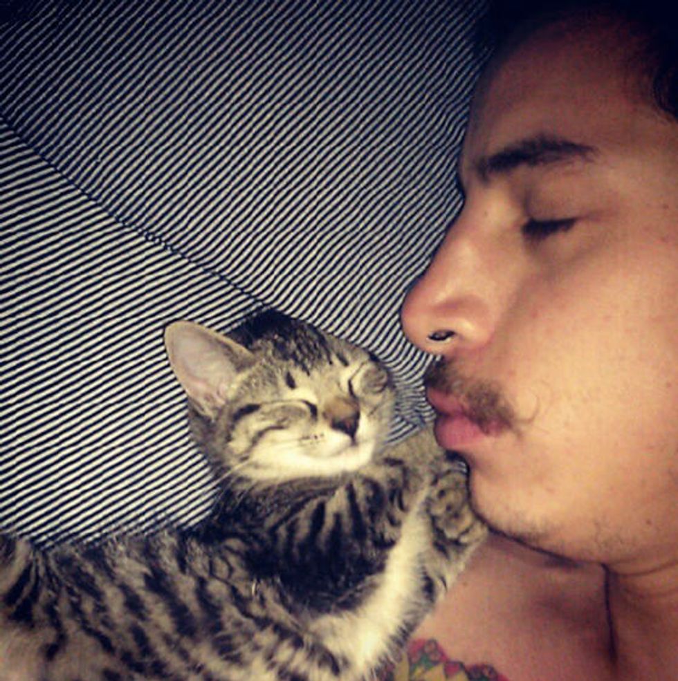 Mary Jane as a kitten and her human Rudi. She started going on trips with him when she was 2 months old.