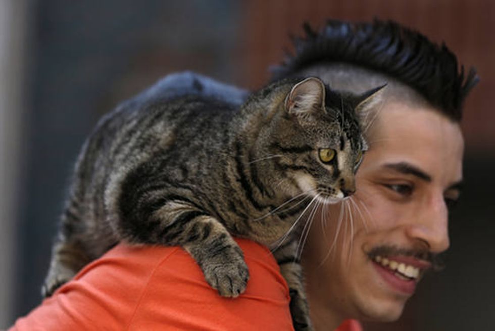 MJ has been accompanying Rudi on his cycling trips since she was a 2-month-old kitten. They live together and ride around the streets together.