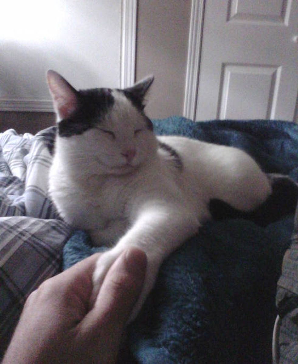 "My cat meows until I stop what I'm doing and hold his hand. Then he sits there and purrs," said Chuvalo's human dad via reddit. "He doesn't always meow for it. But he'll come up, and stretch out his paws, or poke my hand with them until I hold them. Definitely weird behaviour for a cat. But I don't mind !"