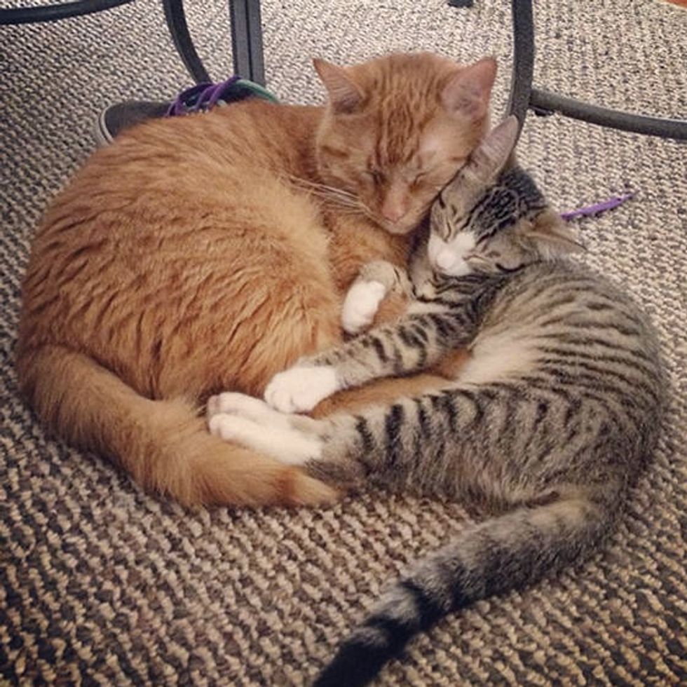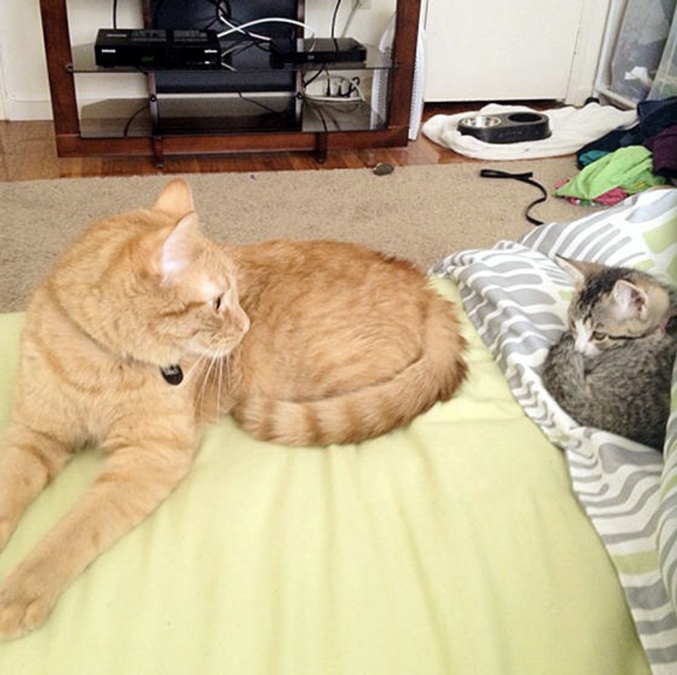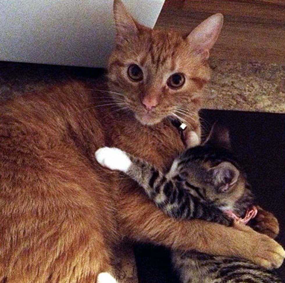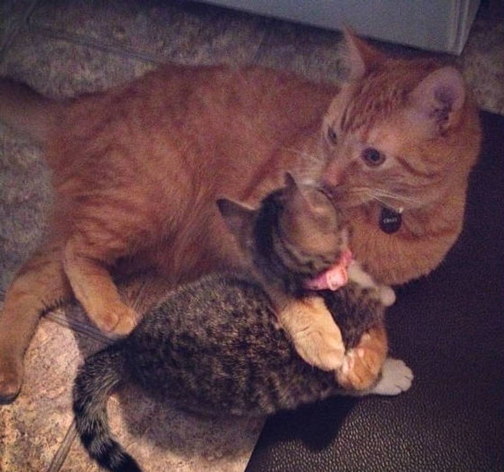 "She seems perfectly fine and happy now," said Justin G. via reddit. Chazz the 1 year old ginger cat took to the 2 month old kitten after they just met a couple of weeks ago. It was like love at first sight.