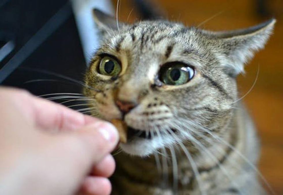"Sadie is my office cat. When I arrive in the morning, she jumps on my desk and proceeds to alternately head-butt me while purring and growl and try to bite me. She will not go away until she gets treats," said The Cat Doctor via reddit.