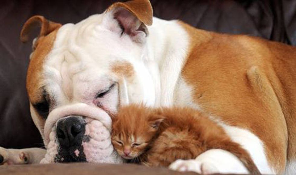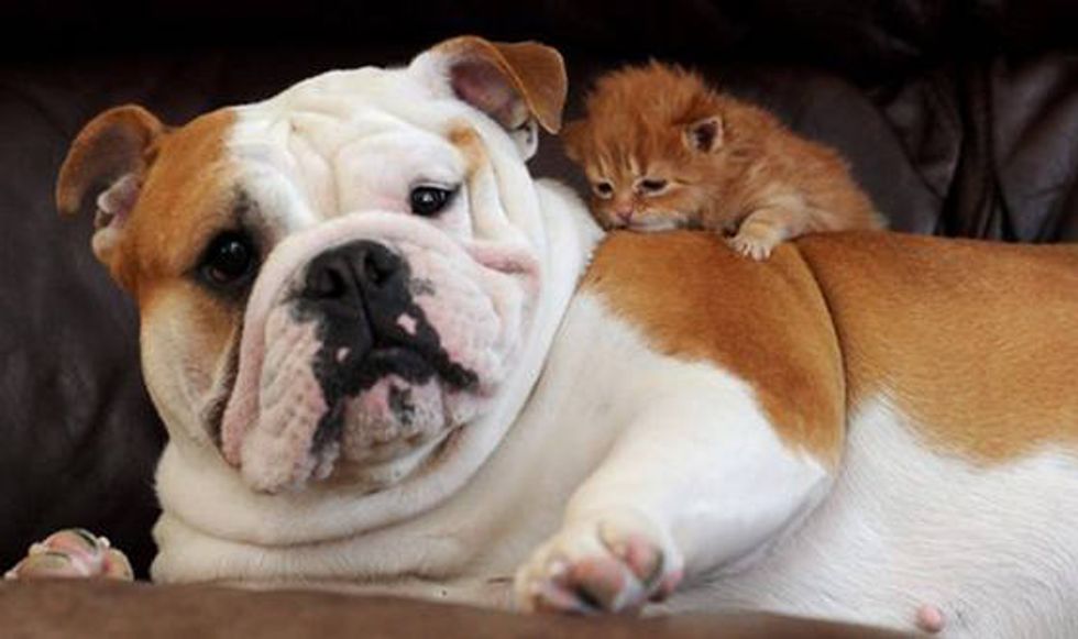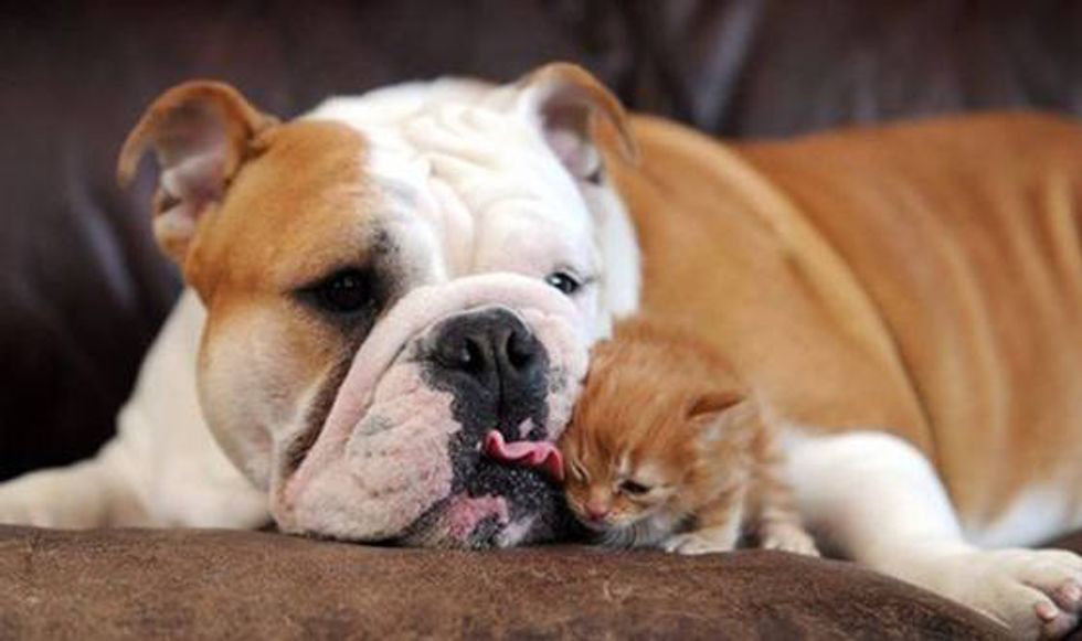 A tiny orphaned kitten has found an unusual new mom, a bulldog named Harley, who adopted him and started producing milk to nurse the little one.