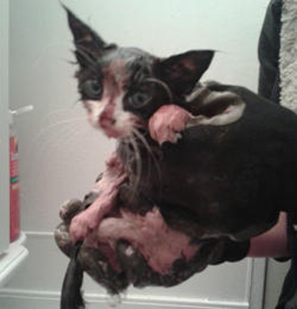 She was found through the backdoor covered in blood from the amount of fleas on her. They gave her an emergency flea bath and named her Cosette