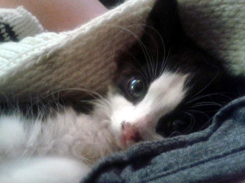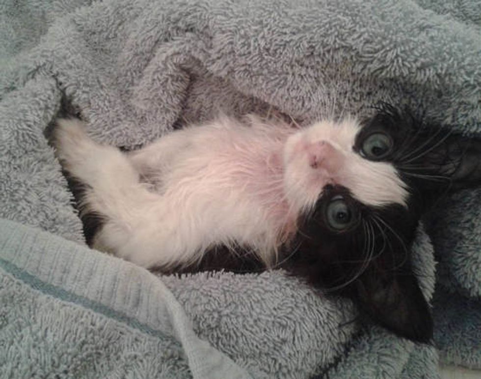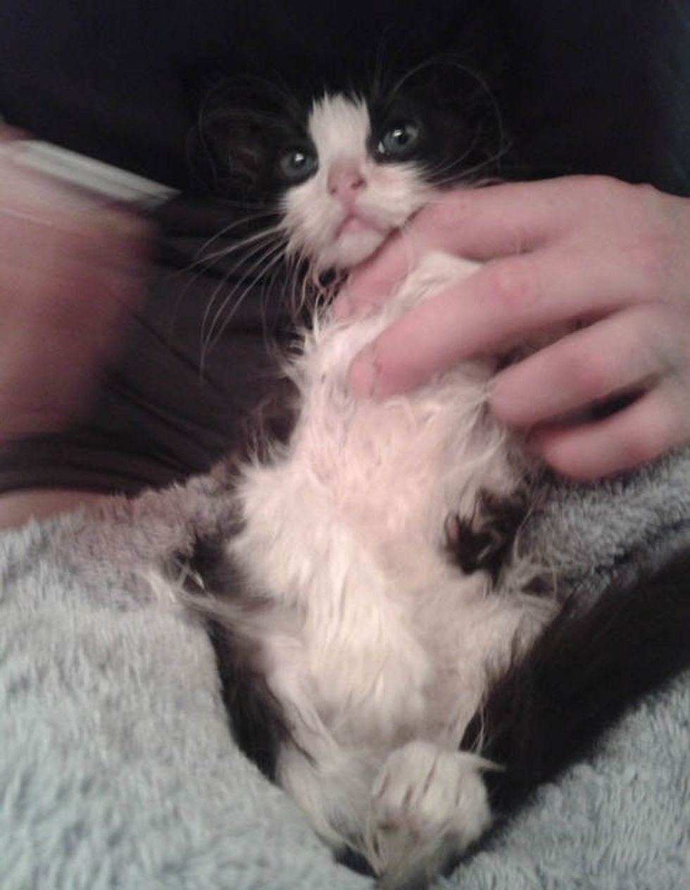 "We had to catch her in a towel because she was hissing and spitting at us. Once we grabbed her by the scruff of her neck there was no resistance. She was anemic and very very weak… She put up absolutely no fight once we had her, and I'm glad that now she's the friendliest kitten ever."