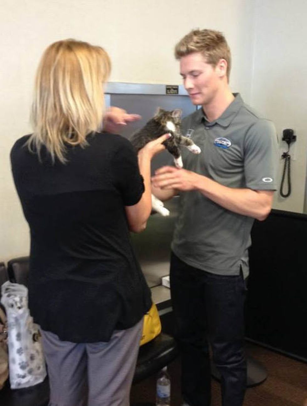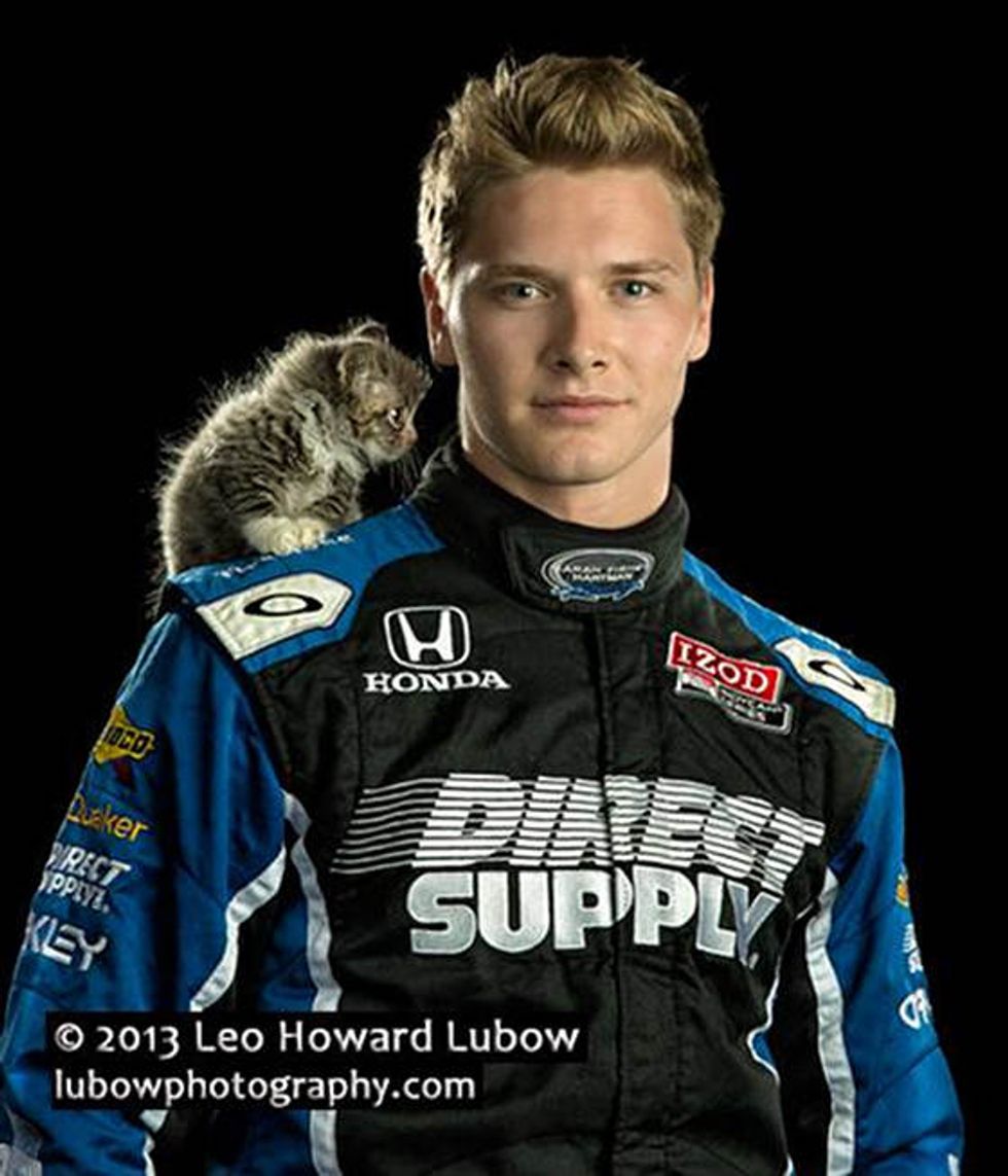 IndyCar driver Josef Newgarden adopted the tiny kitten MJ that he befriended at a photo shoot for an anti-animal abuse campaign.