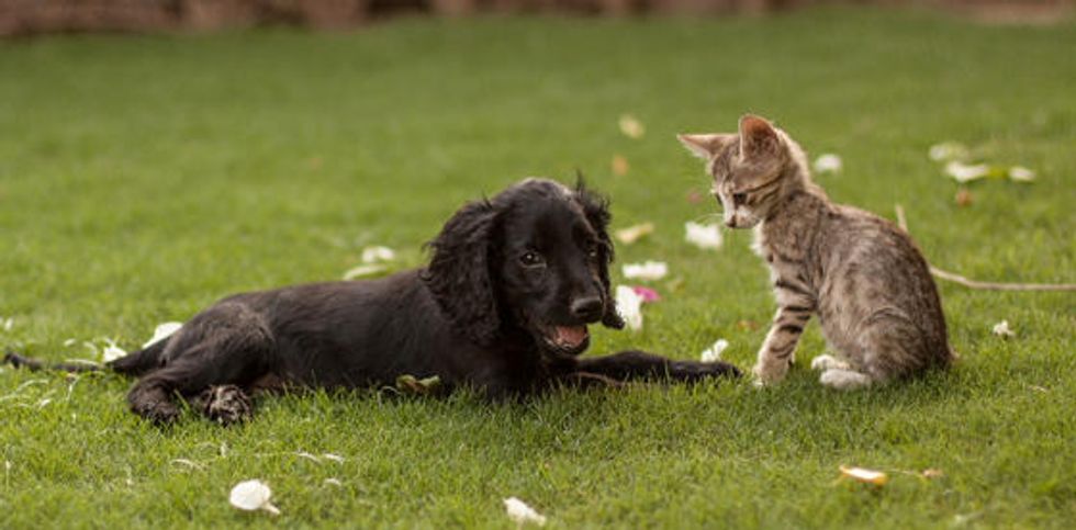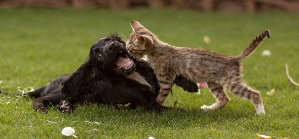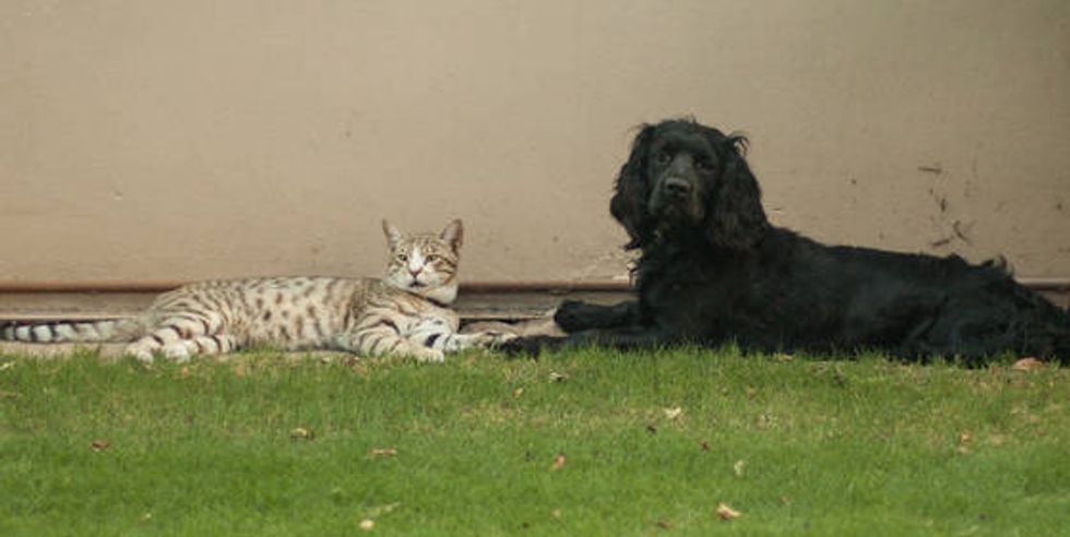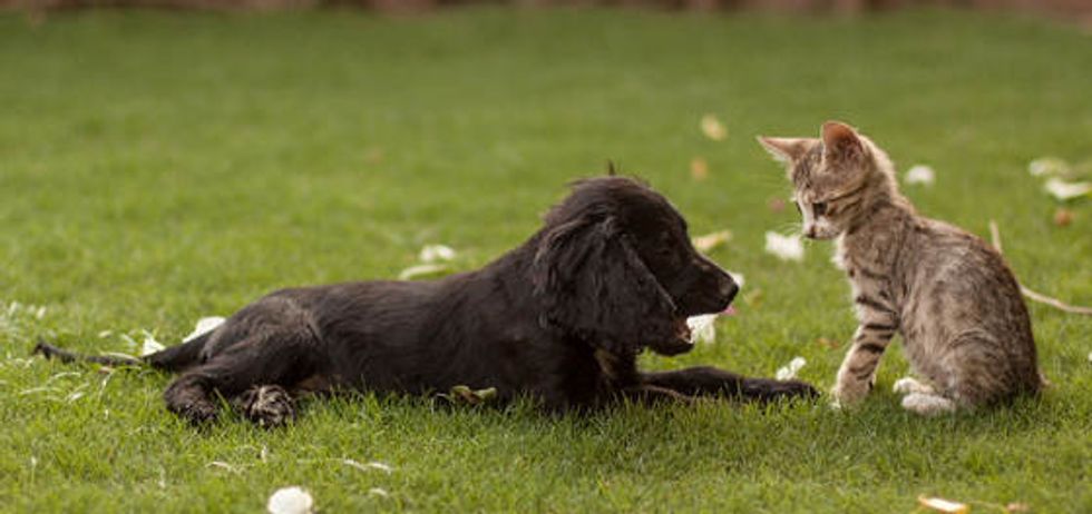 A stray cat was saved by a kind person when he was just a few weeks old. He met the family pup, a Spaniel, who was about the same age. The two took to each other and the rest is history.