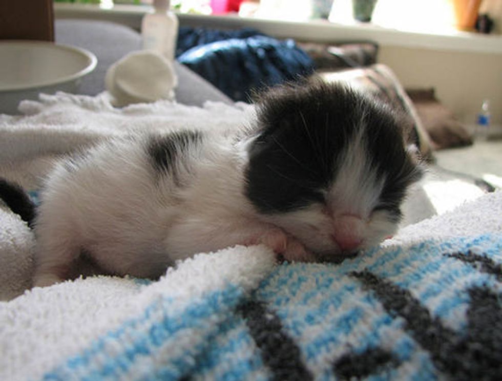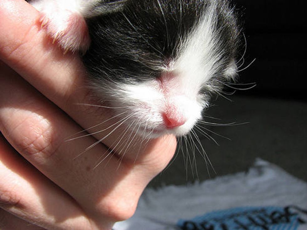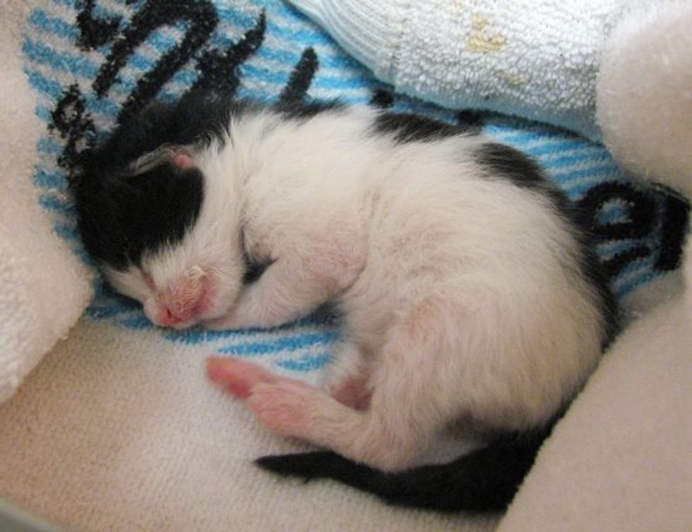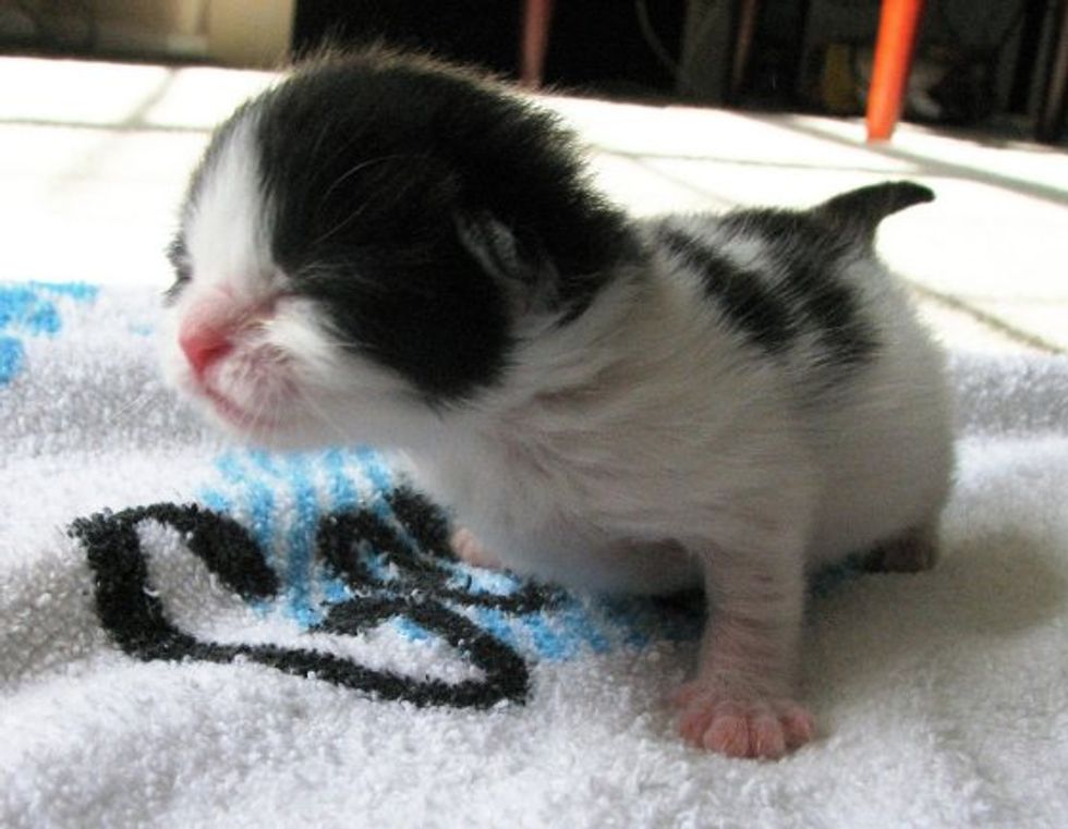 A tiny cow kitten found her human when she was still a baby. She was saved by the Valley Cats in Phoenix, Arizona. They named her Robochan.