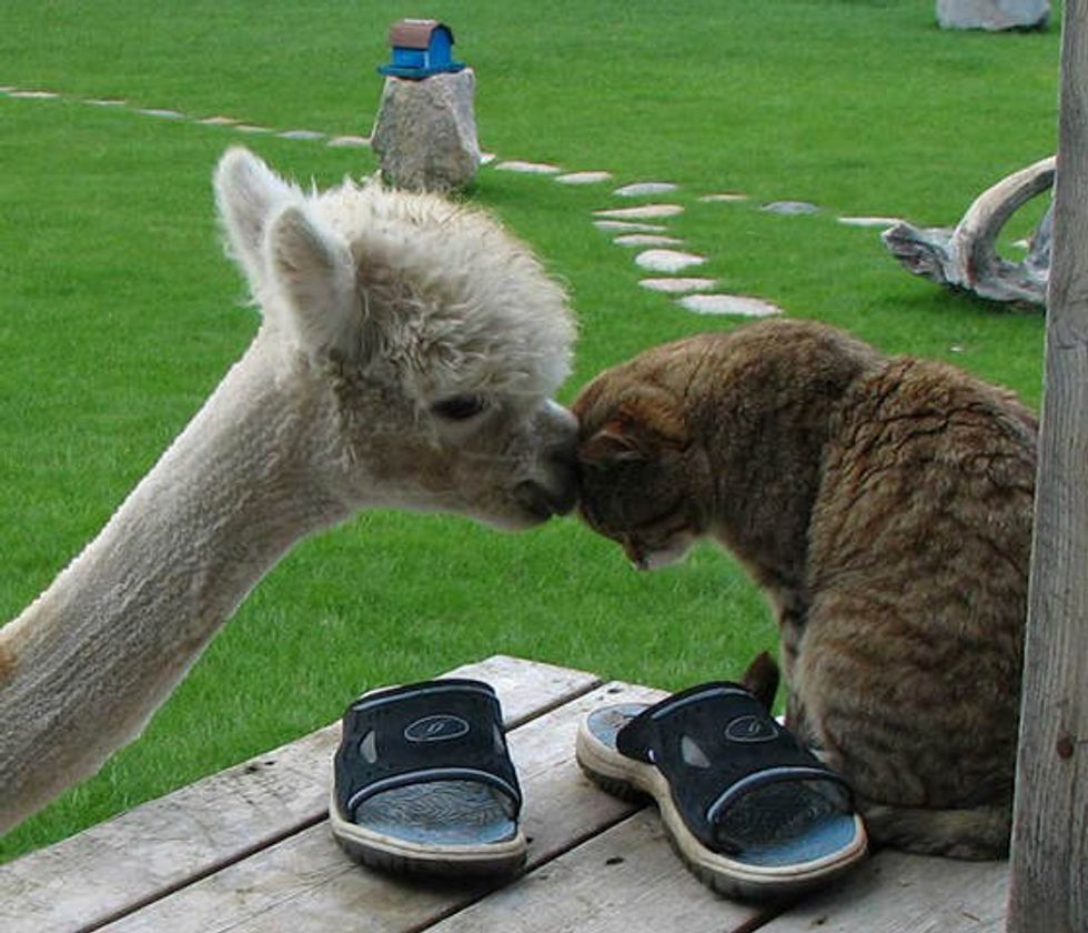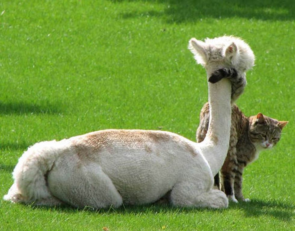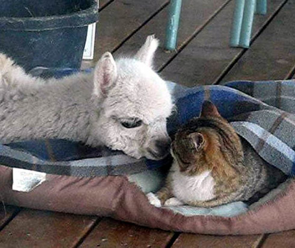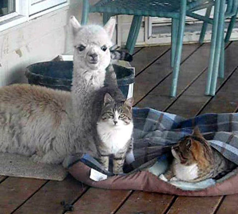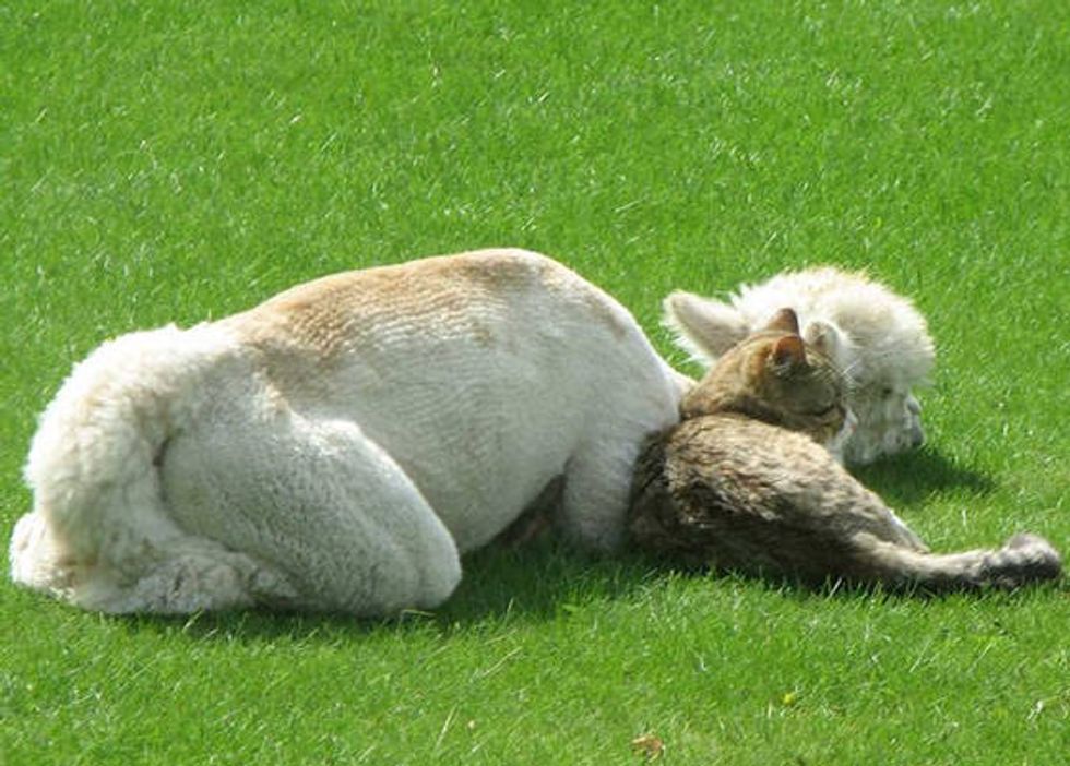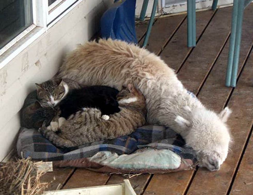 Lacey the alpaca grew up with a couple of cats. This is them cuddling up for a nap together.