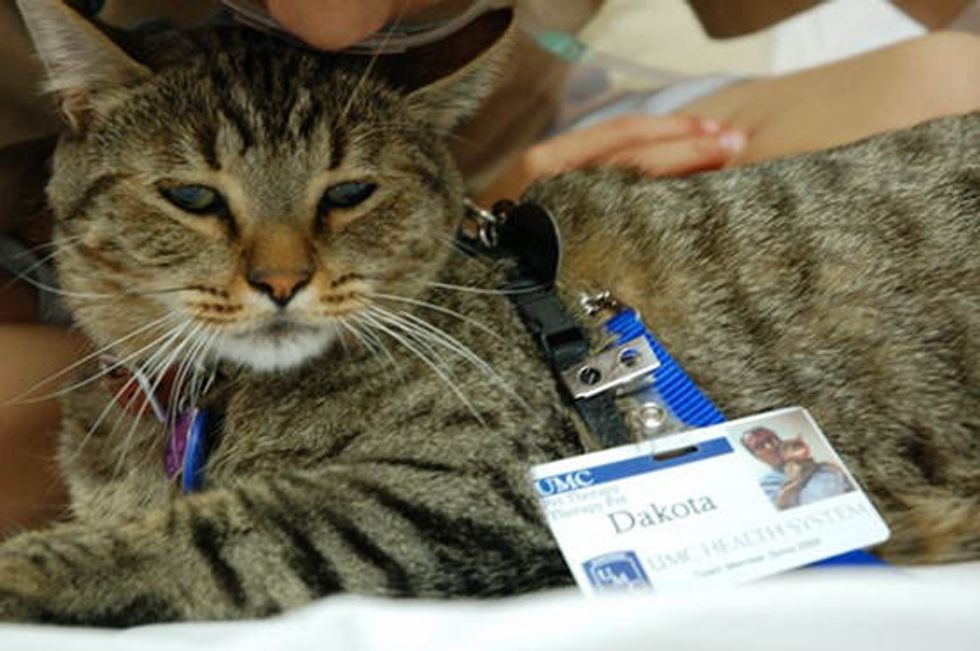 "Though not raised around children, he seems to know just what to do to comfort them." Dakota became a therapy cat at the University Medical Center Hospital in Lubbock, Texas.