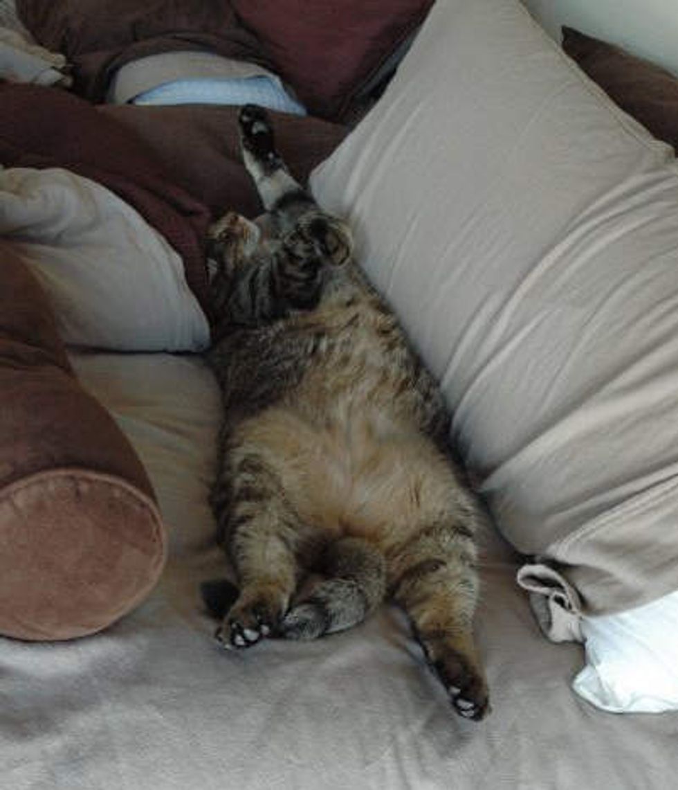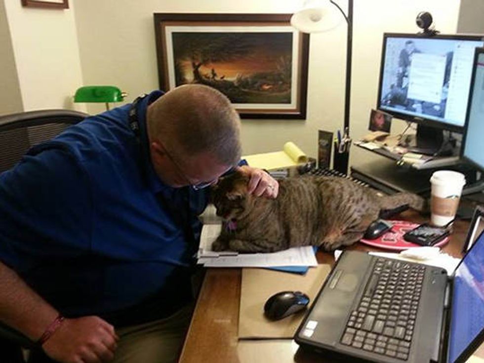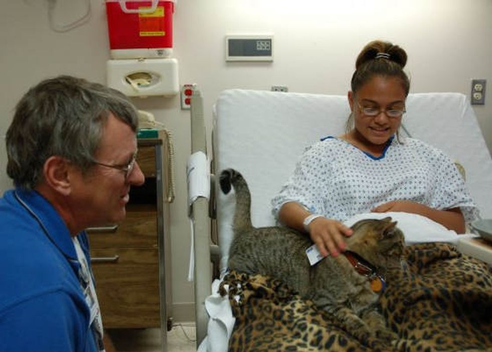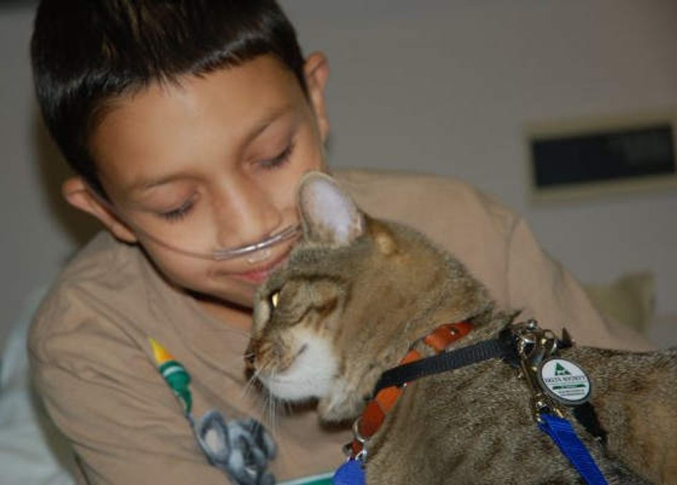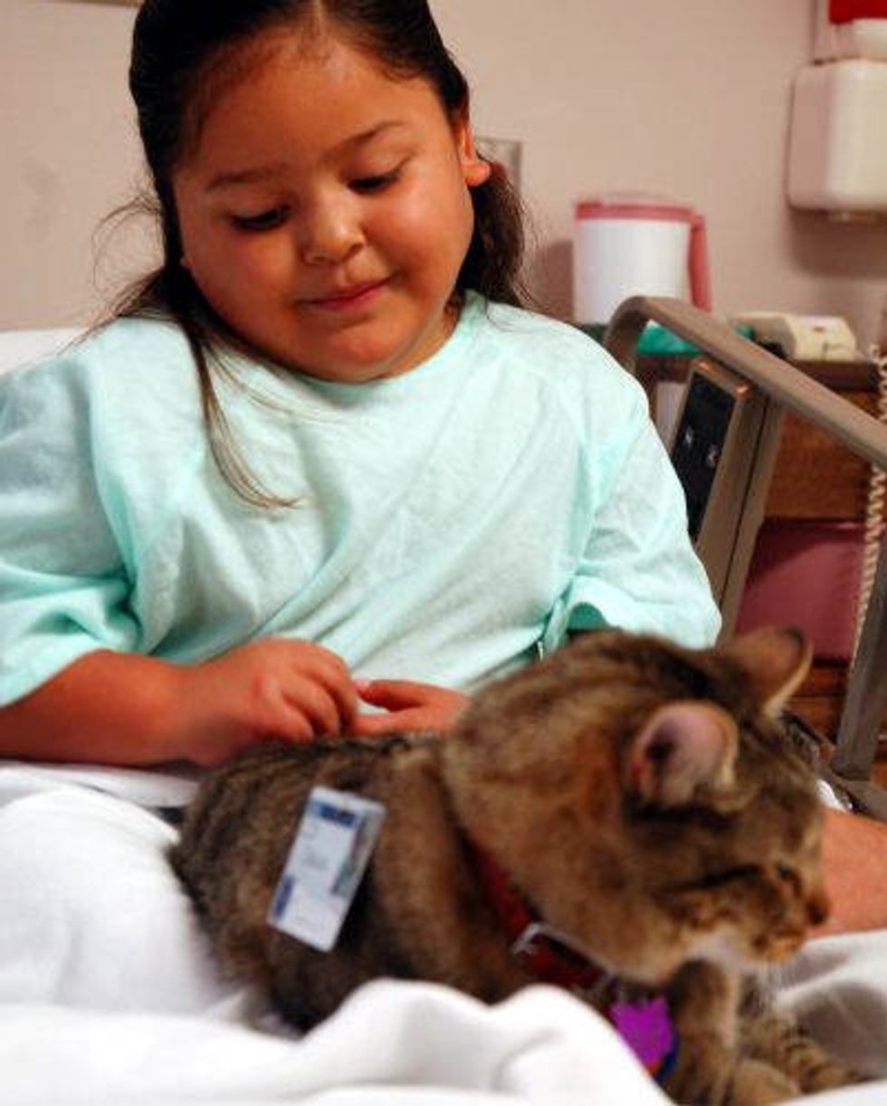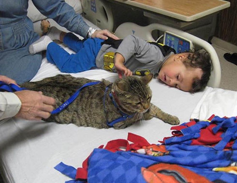 Dakota the tabby was born in the wild, but has become a therapy cat and a little hero at a hospital for about 8 years. He brings smiles and hope to the patients there especially children.