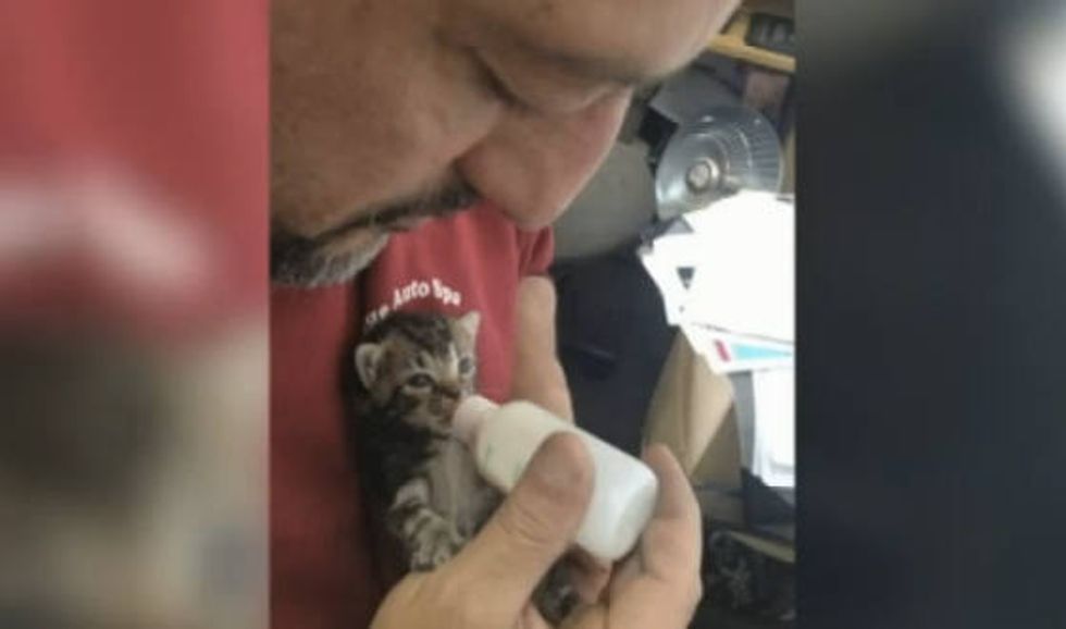 Staff from an auto repair shop in New Jersey are now bottle feeding three little kittens that they rescued from an abandoned car towed to the garage from somewhere in New York State.