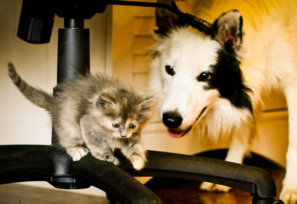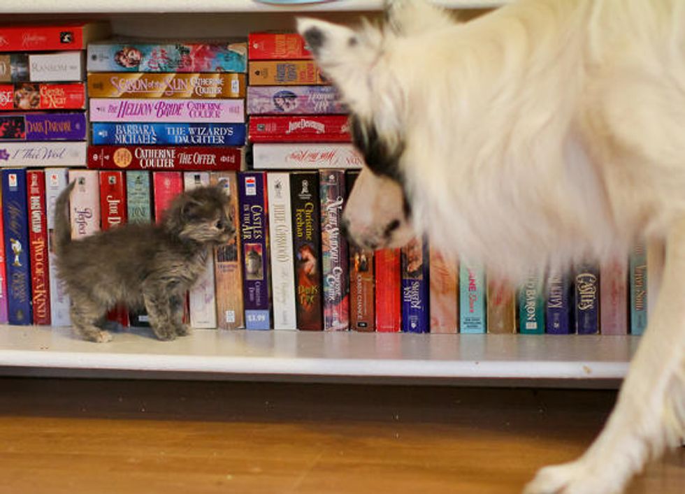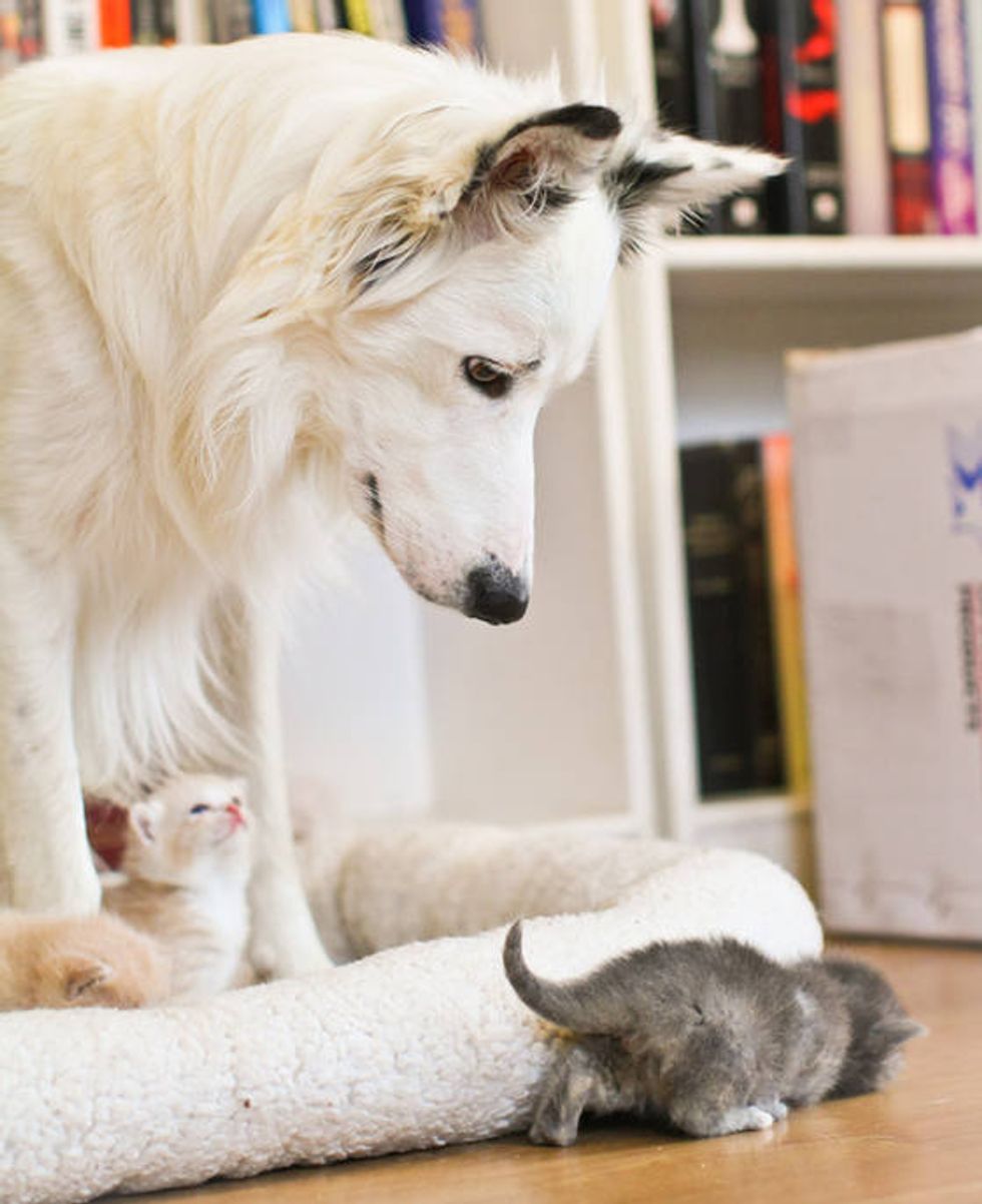 She has a nanny, Haku the dog who fell in love with the little ball of fur when he started cat-sitting the kittens.