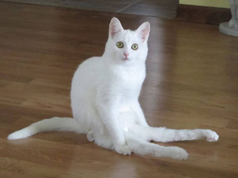 Meet Yoga, a paraplegic kitty who is truly special. Though she can’t use her back legs or tail due to an injury, she can get around the house on her two legs just as well as any 4 legged cats do. She has a wheelchair to help her roll around if she likes, but Yoga loves to walk on her own. And she does it like a champ!
