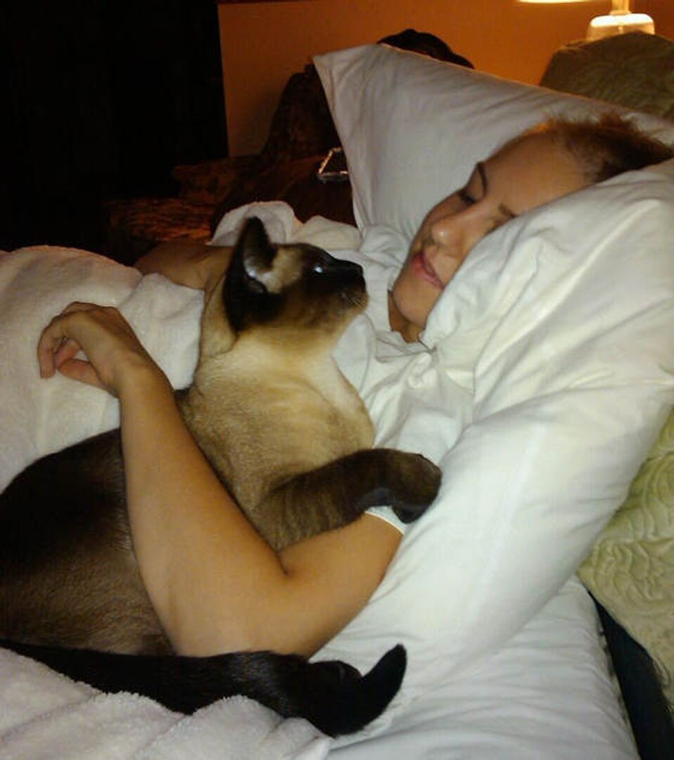 "This photo was taken about two years ago. When I first had my port put in she would lay on my chest and keep it heated. She never leaves my side, but our habits are the same now...sleeping a lot!"