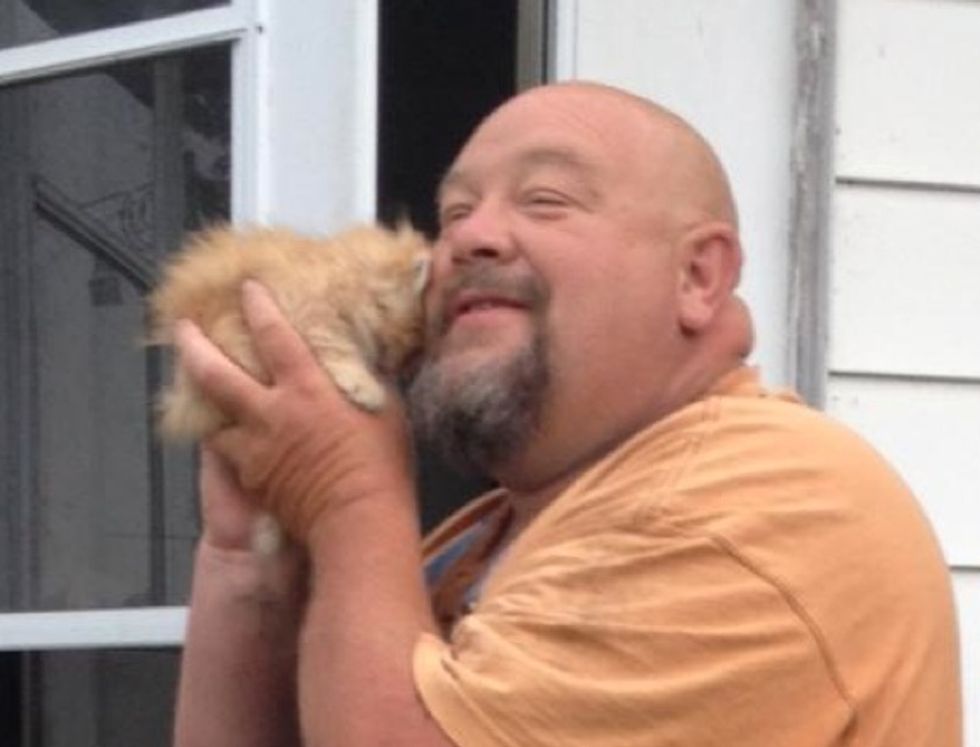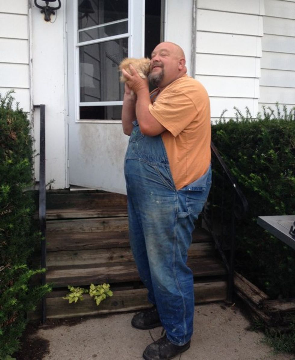 It's pure joy when a "big tough farmer" cuddles with his beloved kitten. He's a big softie when it comes to animals.