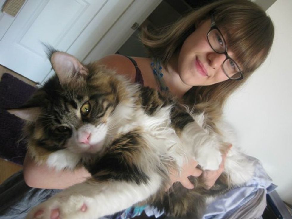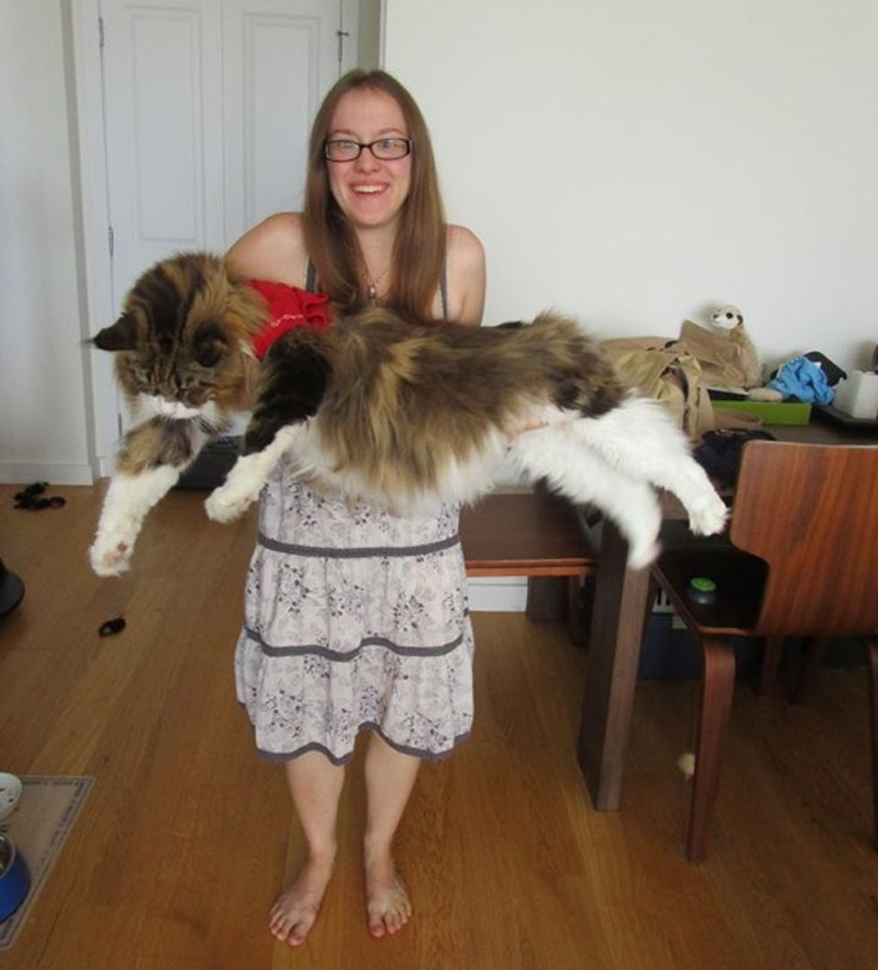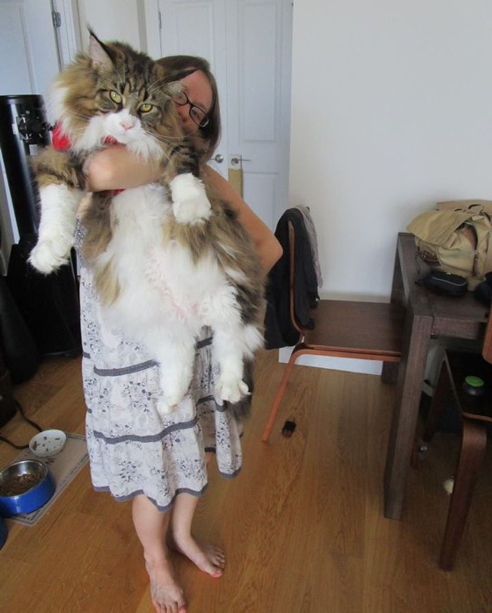 "I'm 4'10", but he is still a pretty big boy," his human mom added. "He's actually not quite done growing yet. Lupo's almost three, and Maine Coons generally finish growing at five. He's got time to become even more fluffy."