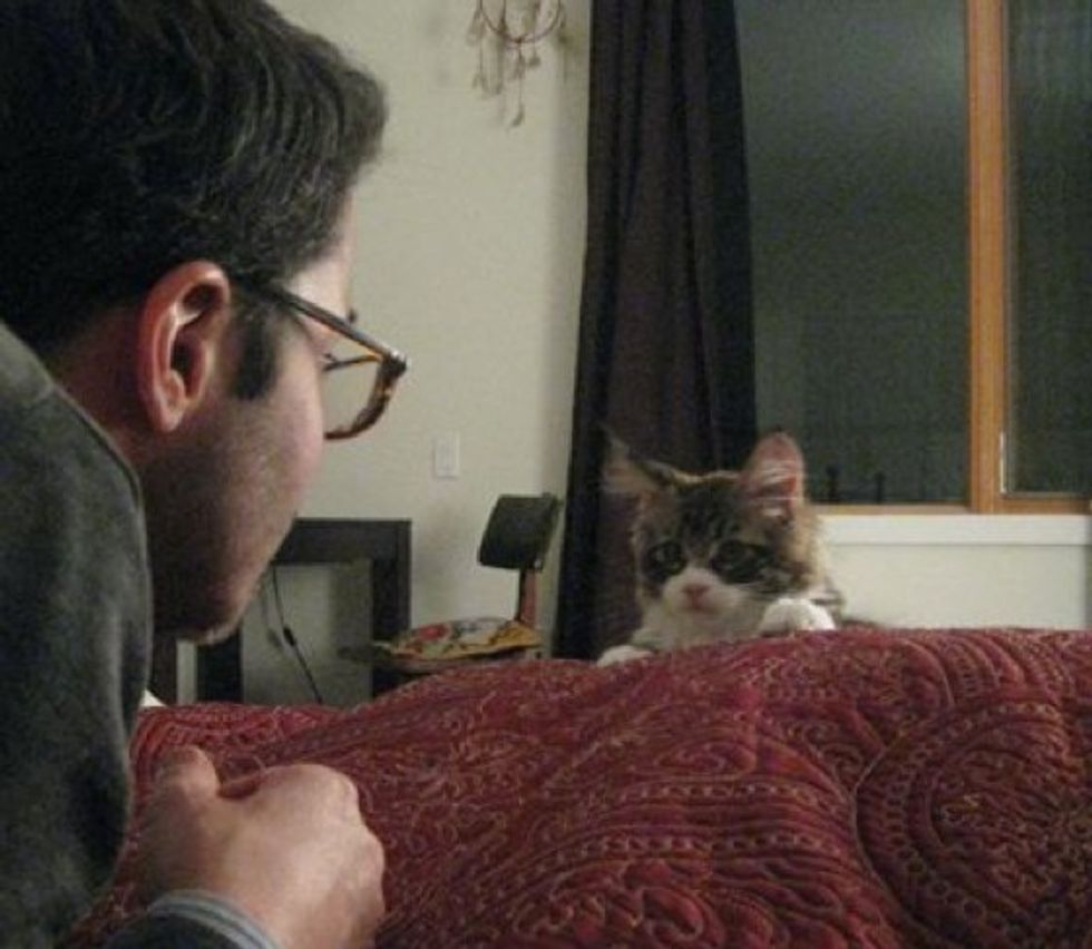 The big kitty follows his mom around the house, and jumps on her lap for cuddles.