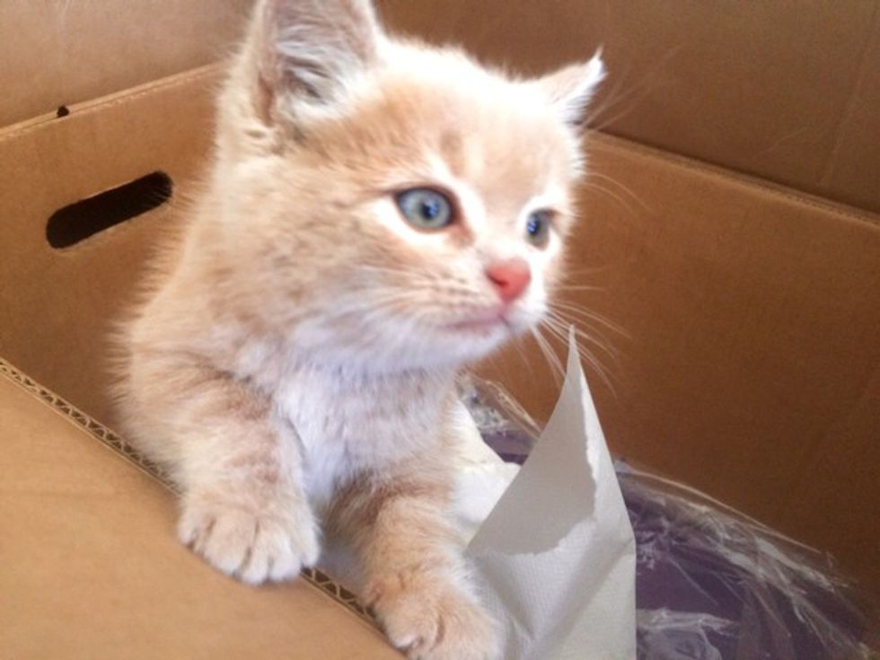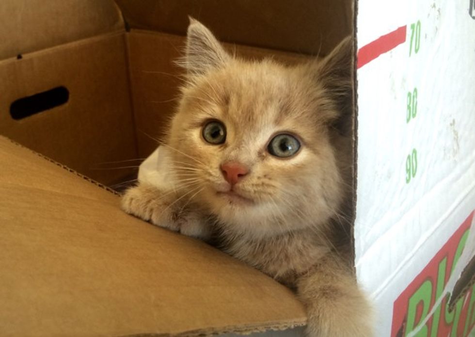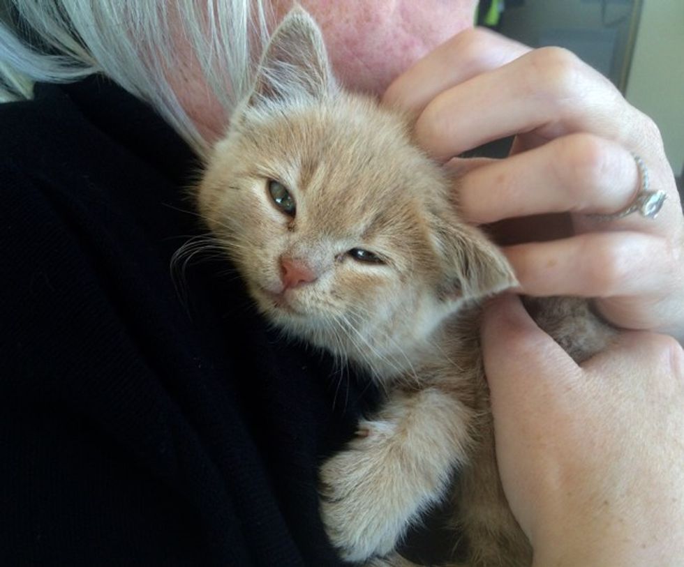 A tiny ginger kitten was rescued from a vehicle's wheel well at a Canadian oil refinery by the workers there. "She was found in a wheel well of a vehicle at work this morning, hiding from a hungry fox," said an employee via reddit.