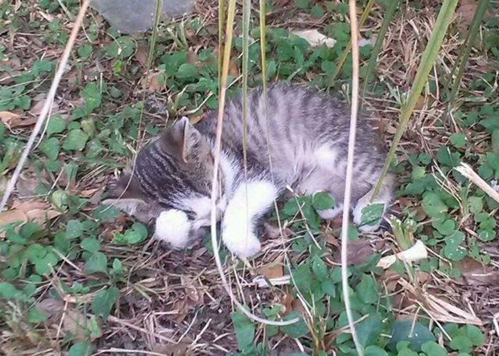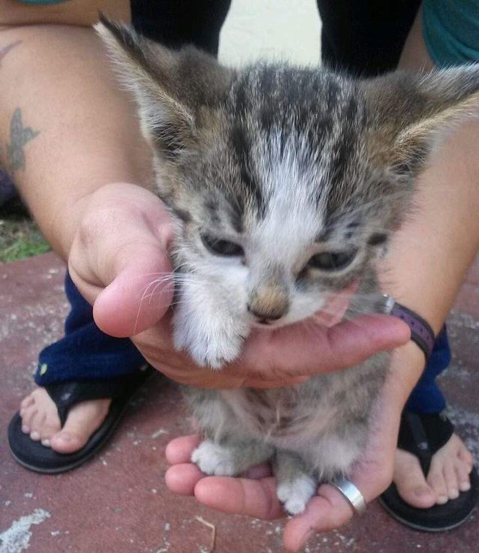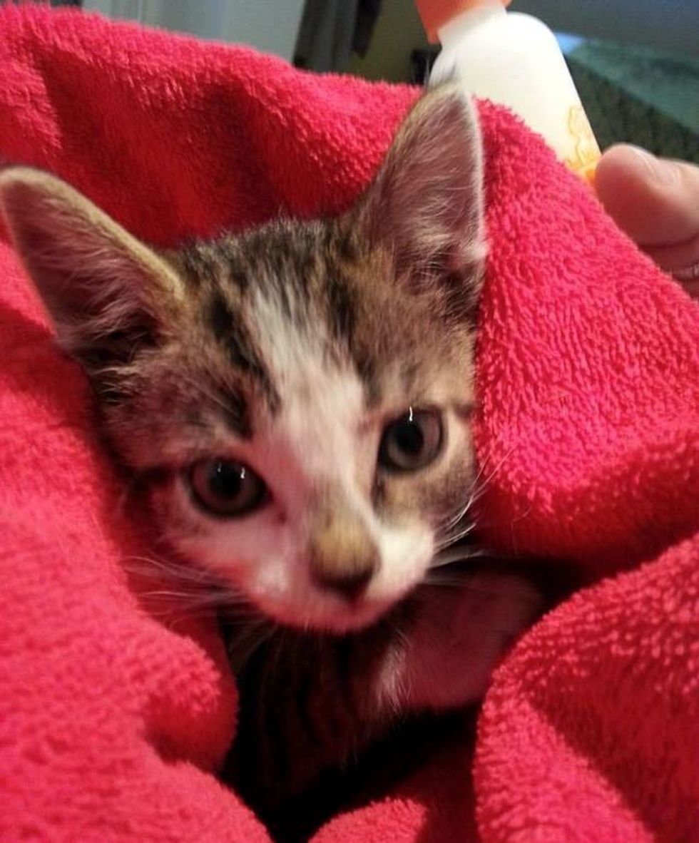 A tiny kitten was spotted by the trash can all by herself. The rescuers from Good Karma Pet Rescue took her in and now she's safe and sound at her foster home with a full belly.