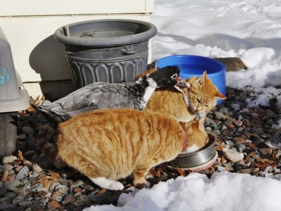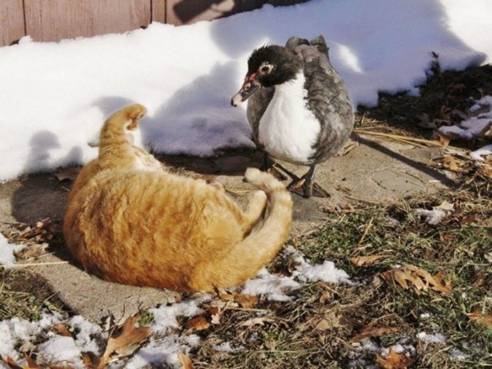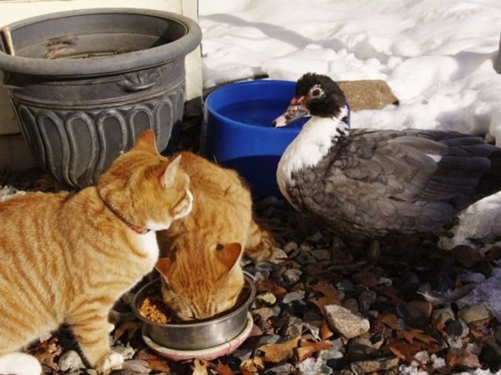 Two cats and a duck adopted each other after they were taken in by a family this year. They share an incredible bond.