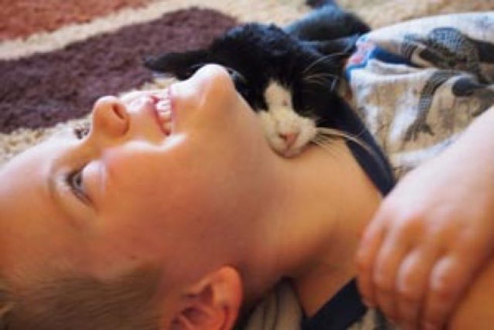 The moment Dexter stepped into his new home, he started cuddling with the boys. It was an instant bond. "Dexter now spends his days hanging out with his new best friends, especially JJ, who helps feed him."