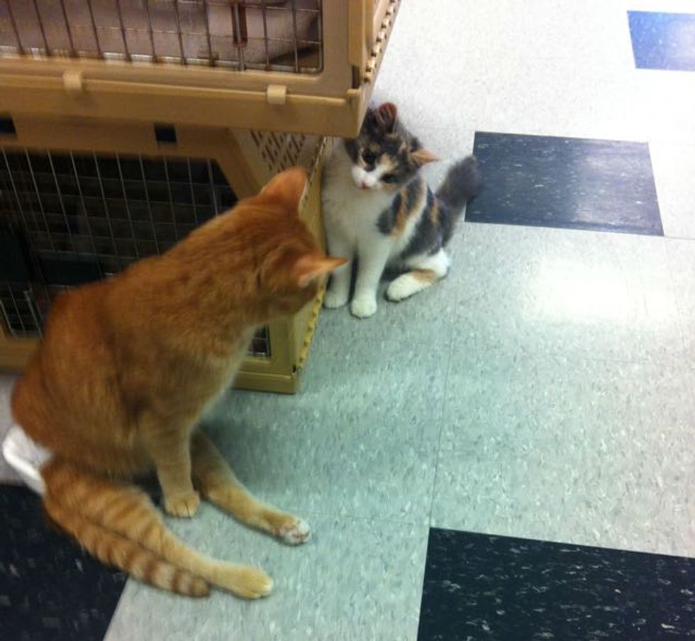 Jesse loves other cats and kittens. Here he's greeting a new kitten at the clinic.