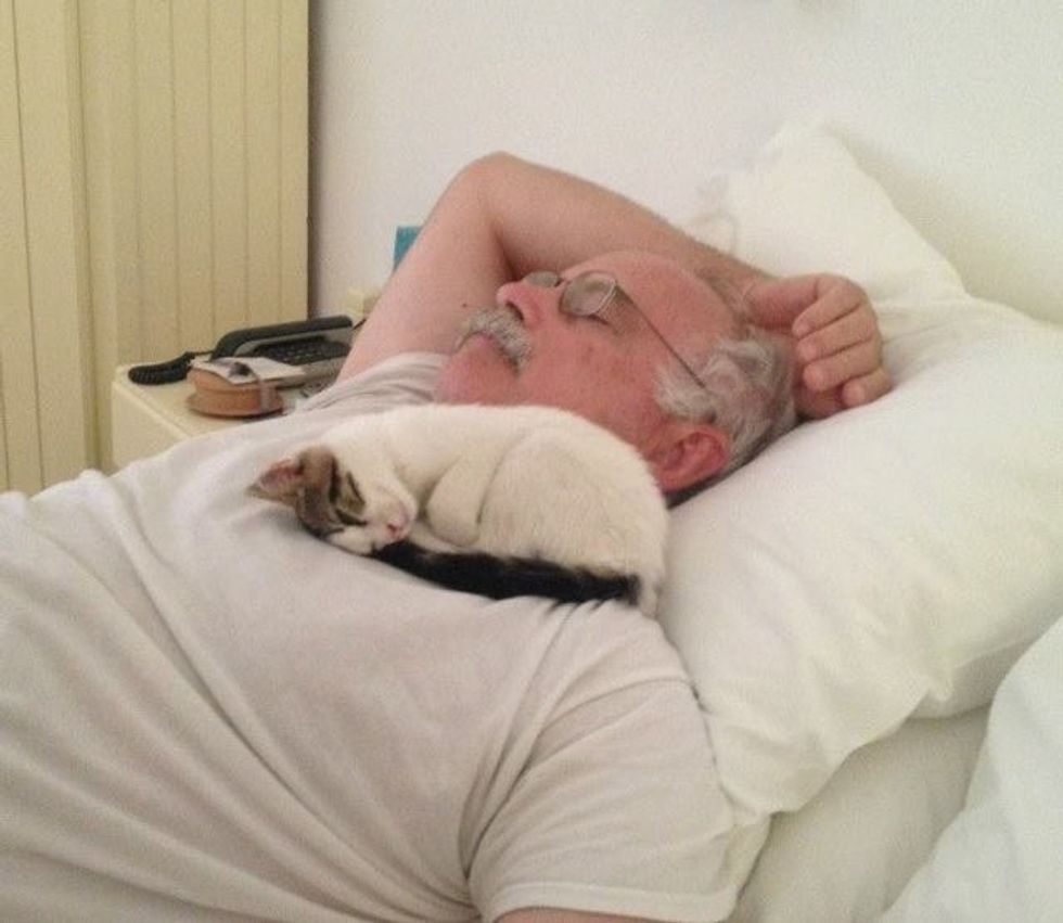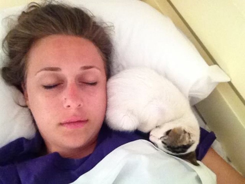 "This kitten lived at the hotel I stayed at in Greece. I snuck her into my room for an afternoon nap and she snuggled right in," msimone282 wrote. (reddit)
