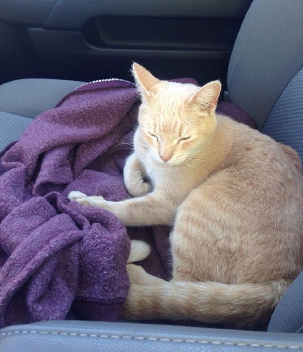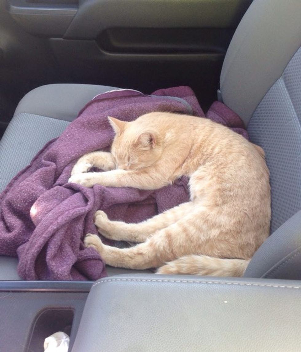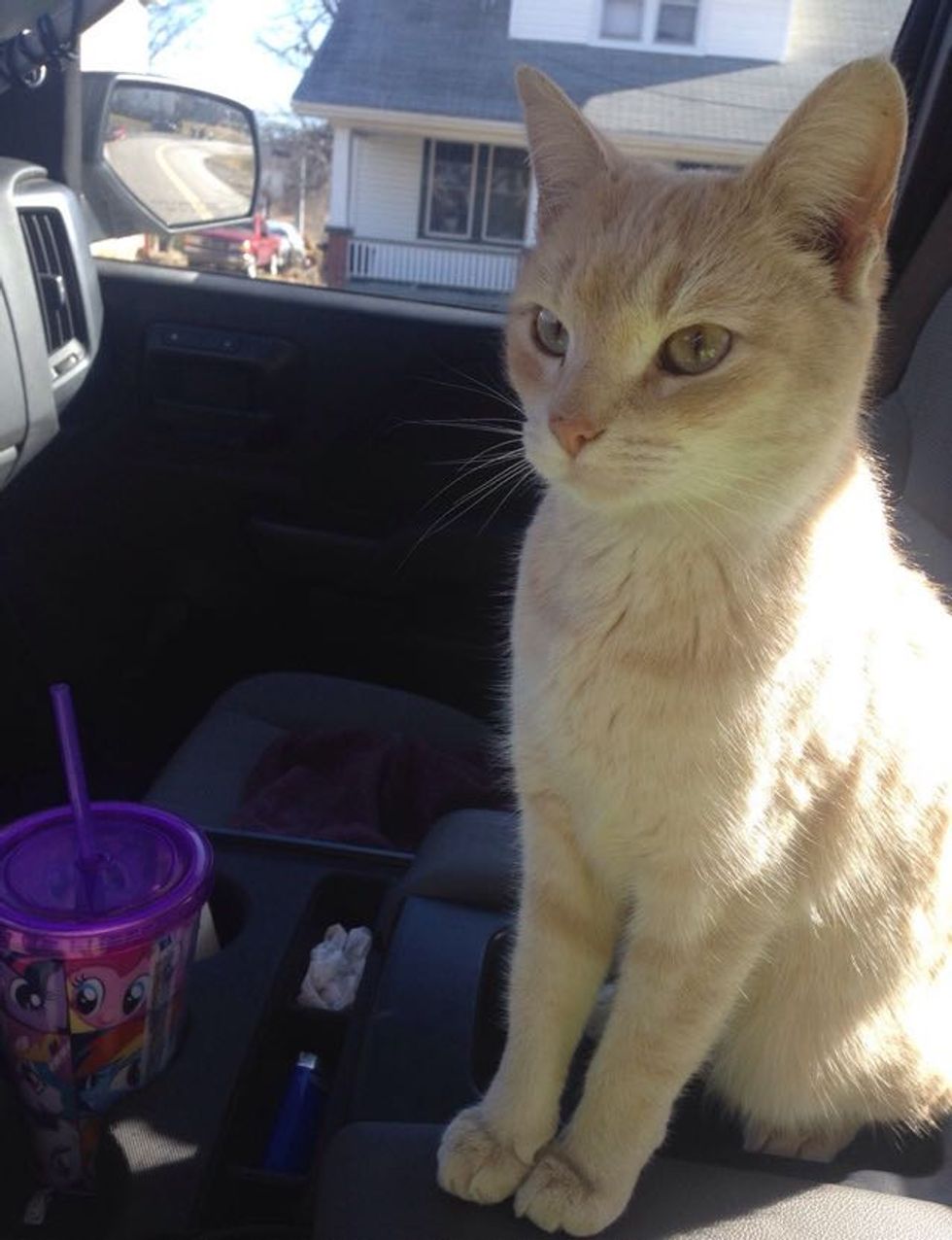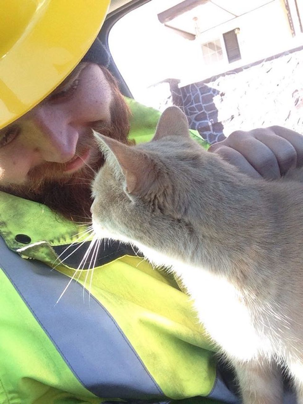 This little furry buddy belongs to a family next door. When the worker parked his truck, the ginger cat went up to him and hopped into his truck. "Having a little furry buddy makes the day so much better."