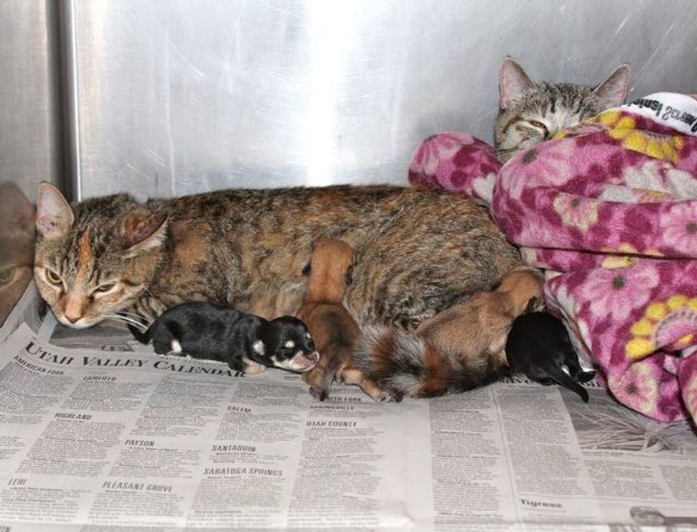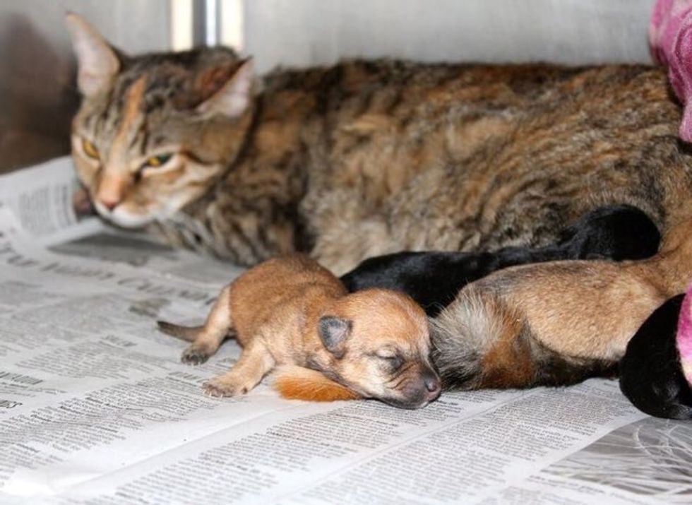 When she took the puppies to the shelter for help, the staff decided to put them with a surrogate cat mom to try to save their lives.