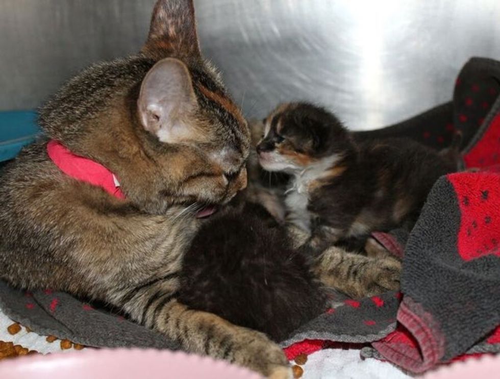 Now Kit is taking care of a new litter of orphan kittens that need some motherly love. When the kittens were introduced to their new mom, she took to them right away and started nursing the little ones like her own.