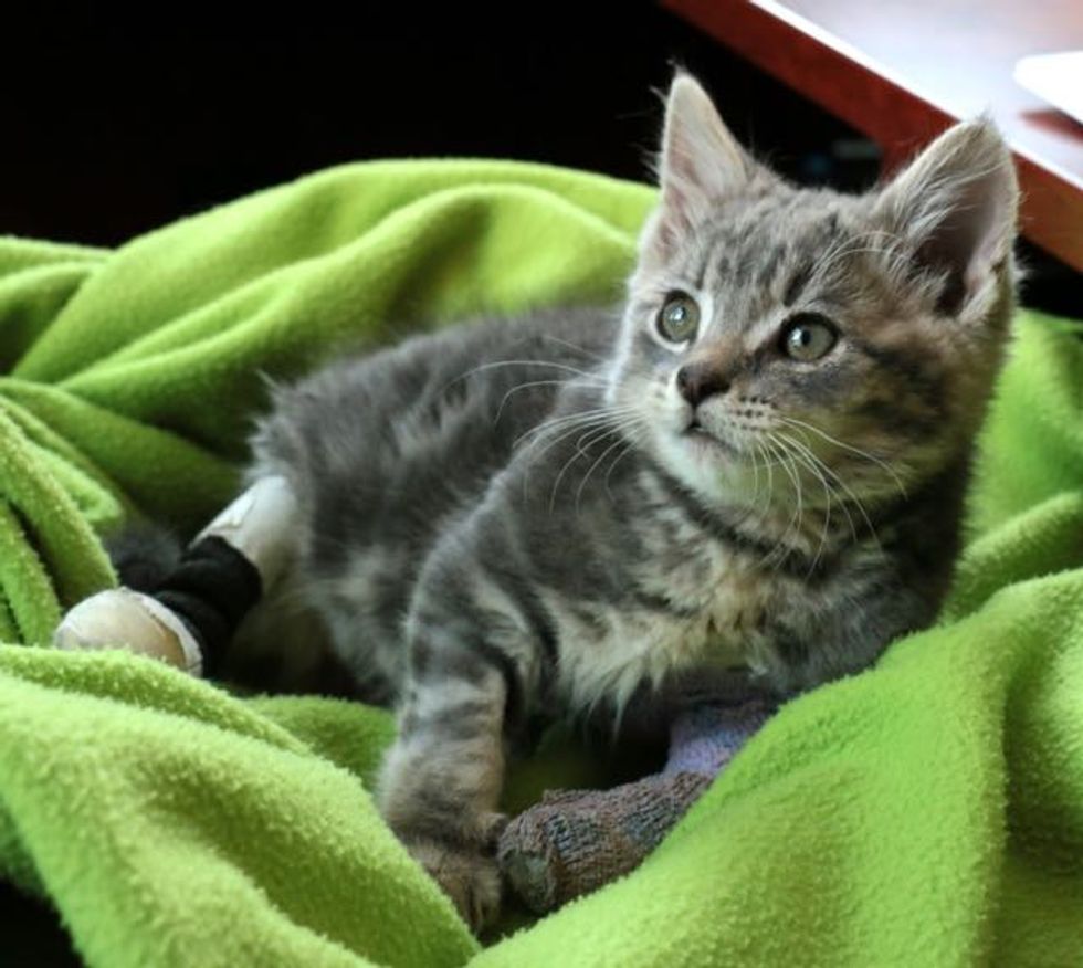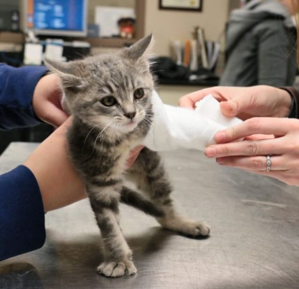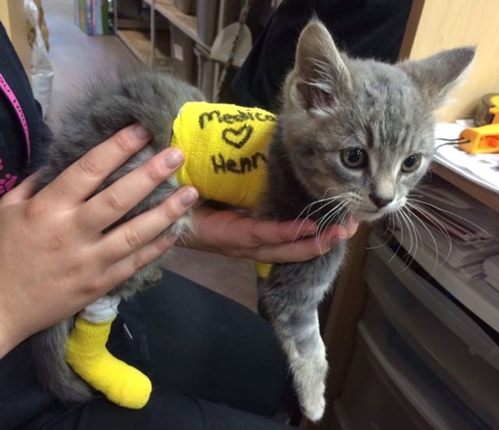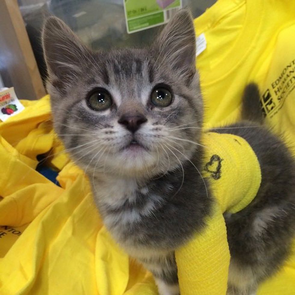 Edmonton Humane Society shares his story: "This little warrior cat is Henry. One day this tiny grey kitten was found at the side of a highway, severely injured after being struck by a vehicle and left abandoned. Kind souls brought him to an emergency veterinary clinic, where he was bandaged and put on IV. Because he was a stray, he was transferred to Edmonton Humane Society.
