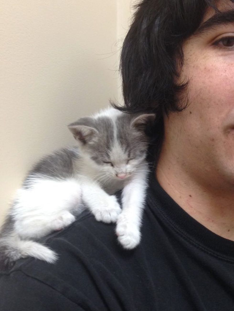 Kitty crawls to the spot where he feels the safest, his human dad's shoulder.