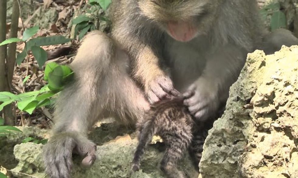 According to Taipei Times, Positi imitated female monkeys to care and nurse his kittens. He fought other macaques for food for the kittens and was seen teasing the kittens to sleep like it would a baby monkey. "It's difficult for people to catch the kittens from the monkey. We have spent a lot of time with them, but it's still not an easy task. It takes two people to do the job," Lin said.