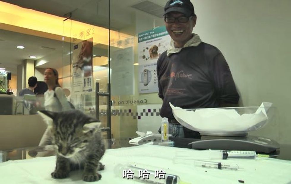 After Lin successfully snatched the kitten from his surrogate 'mom,' he took the little feline baby to the vet for evaluation.