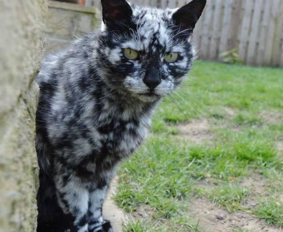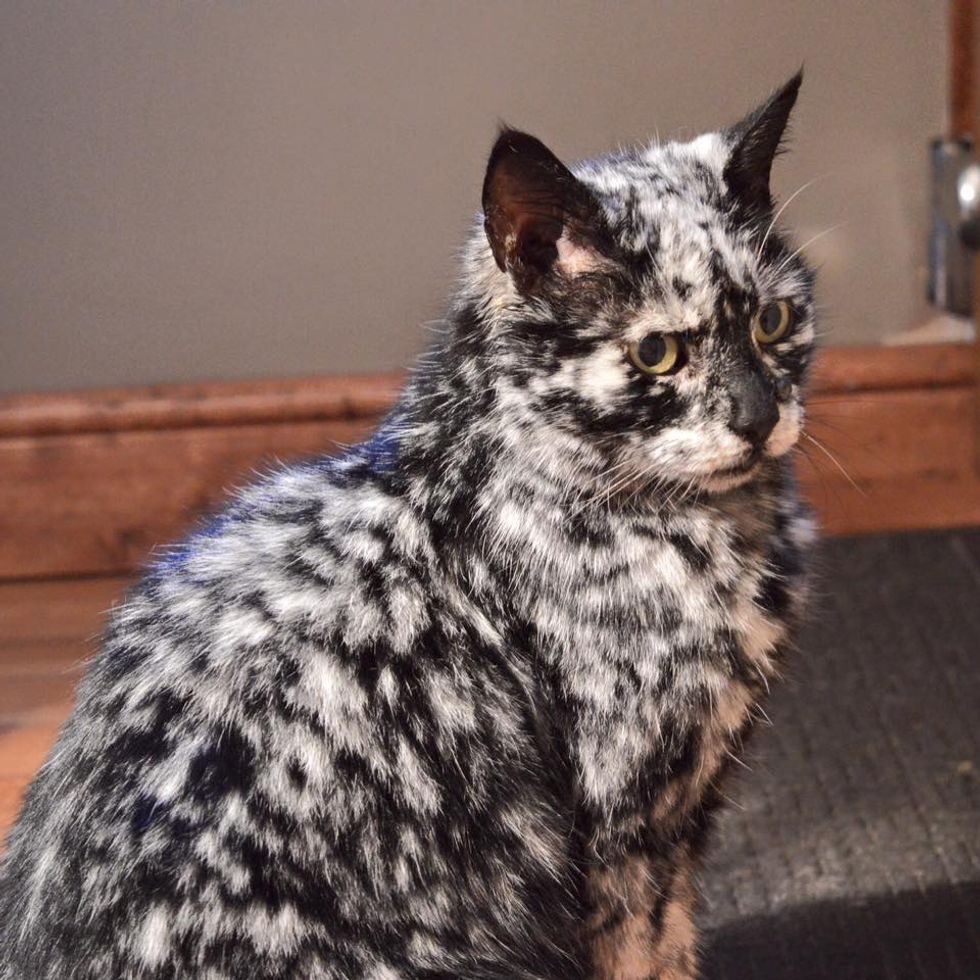 According to Scrappy's Facebook page: "Scrappy was born in 1997 as a black cat and only a few years ago he started turning white (maybe vitiligo) and has ended up with this extraordinary pattern."